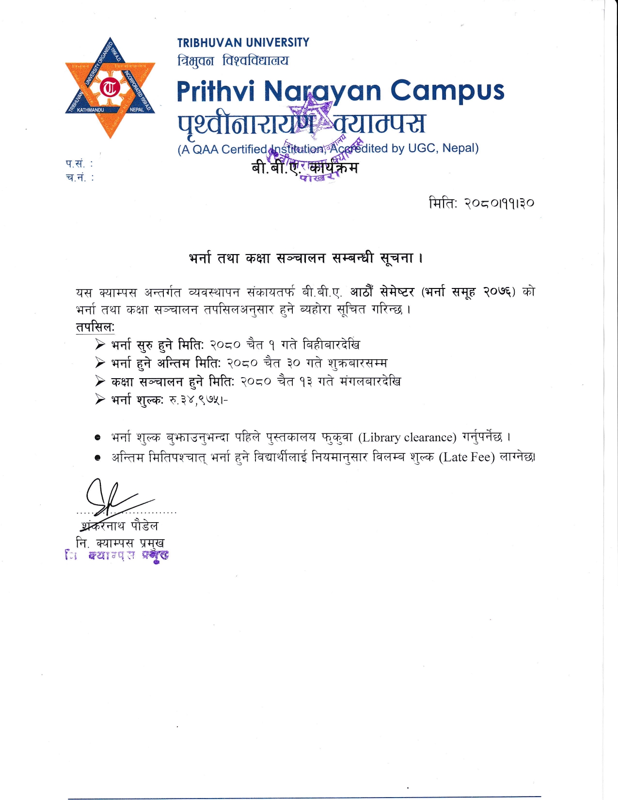बी.बी.ए. आठौँ सेमेष्टरको भर्ना तथा कक्षा सञ्चालन सम्बन्धी सूचना ।