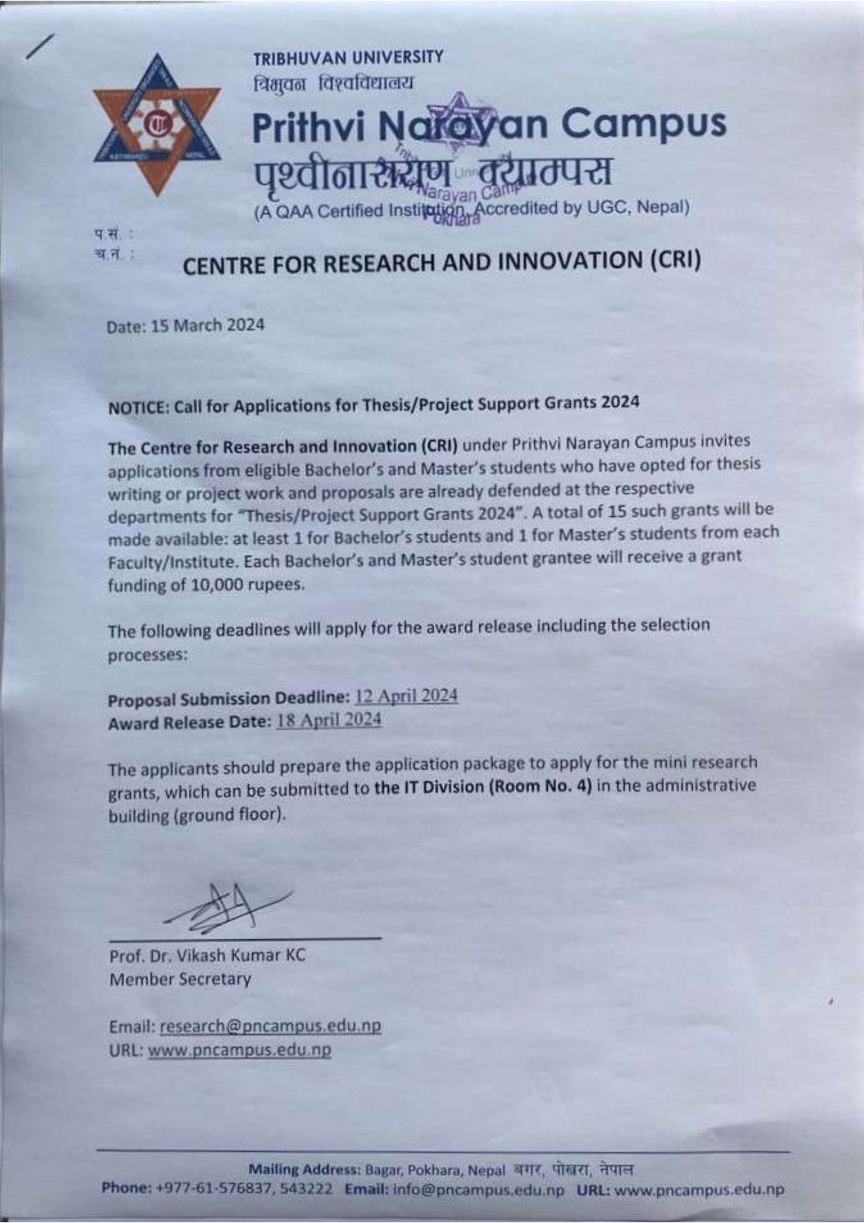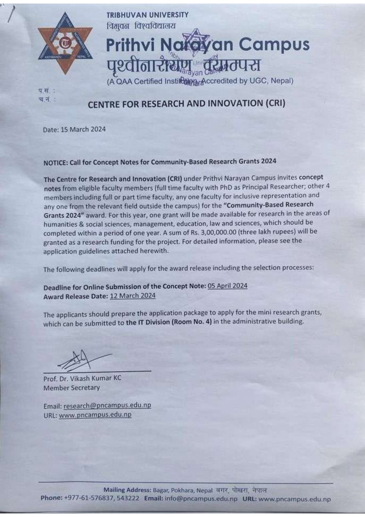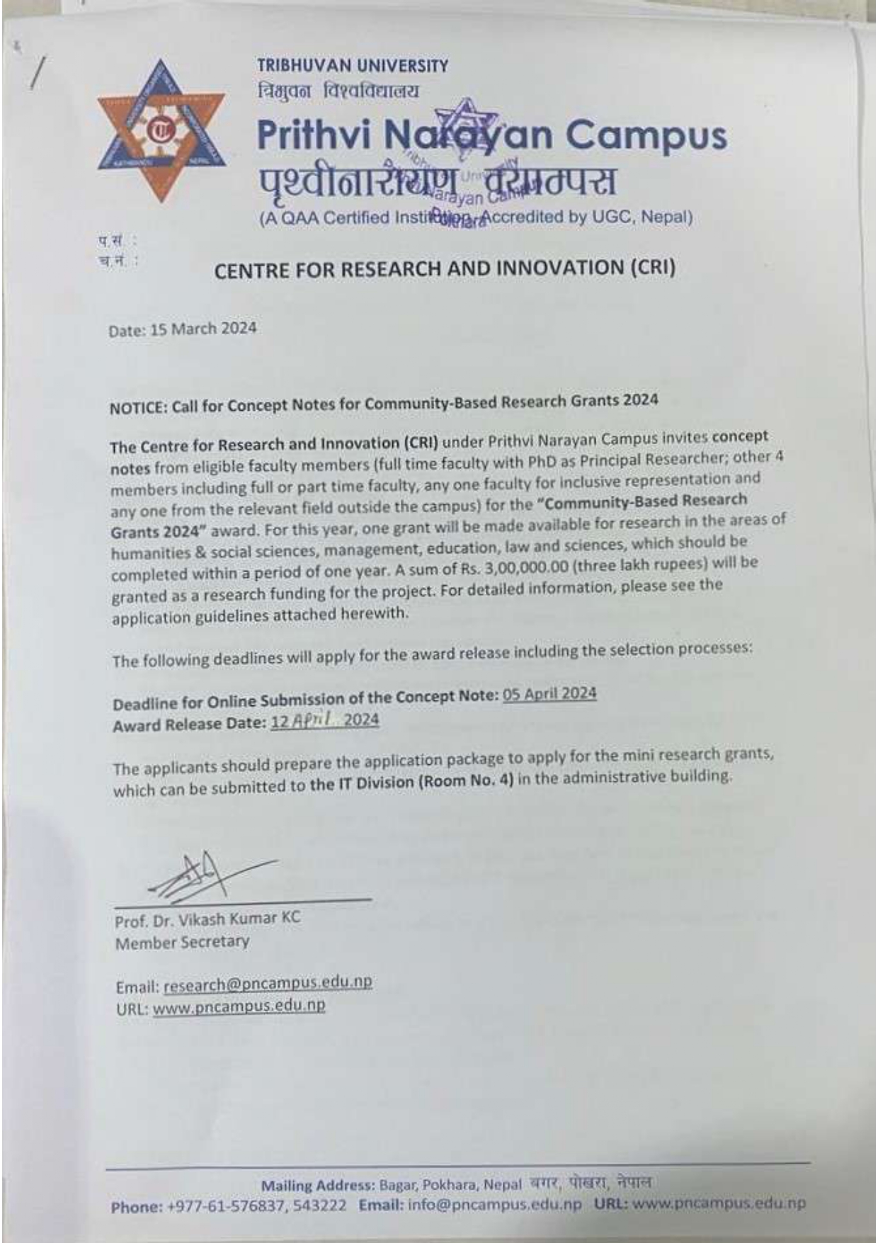 Call for Applications for Concept Notes for Community Based Research, Mini Research (for Faculty Members) and Thesis/Project Support Grants 2024.