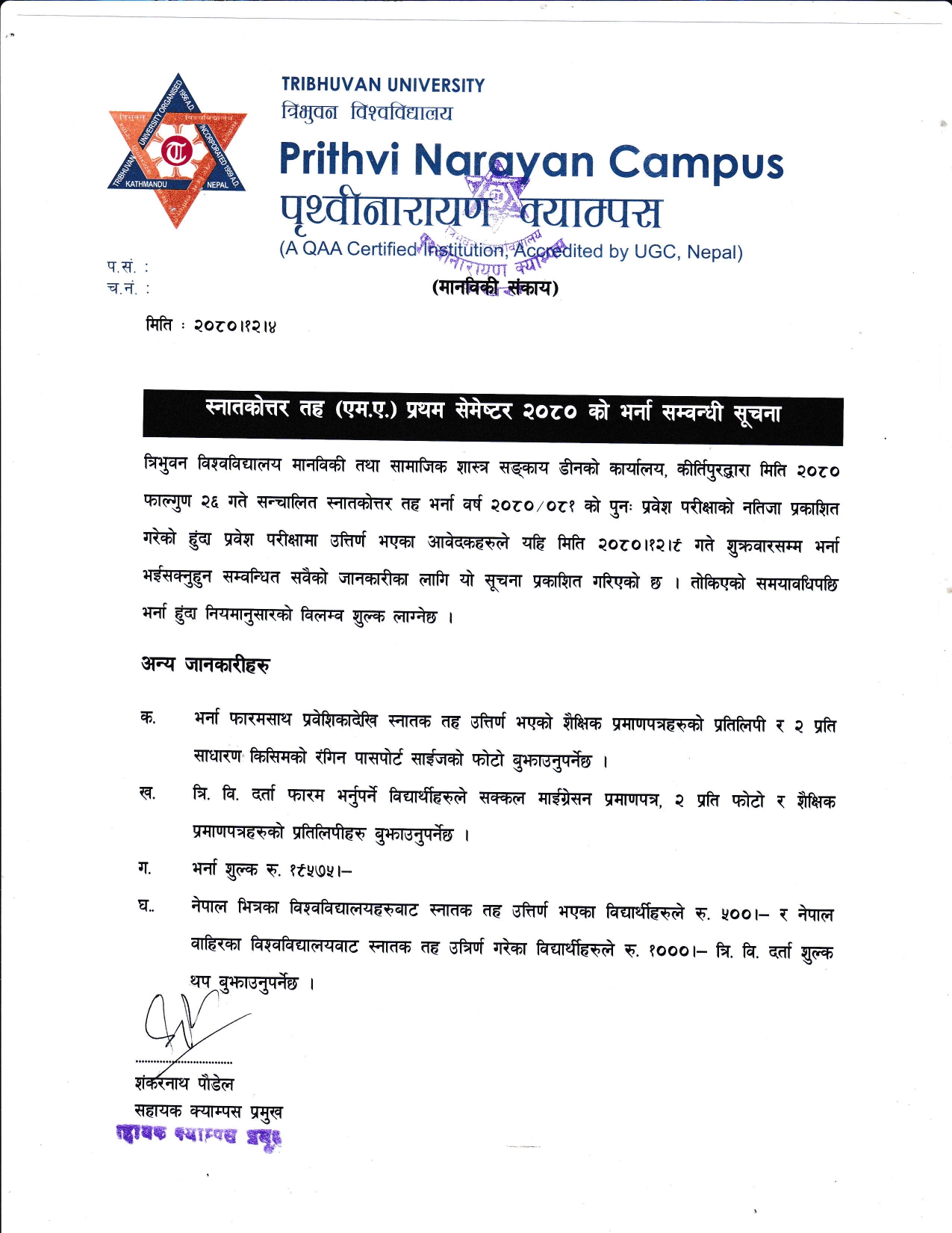 स्नातकोत्तर तह (एम. ए.) प्रथम सेमेस्टर २०८० को भर्ना सम्बन्धी सूचना ।