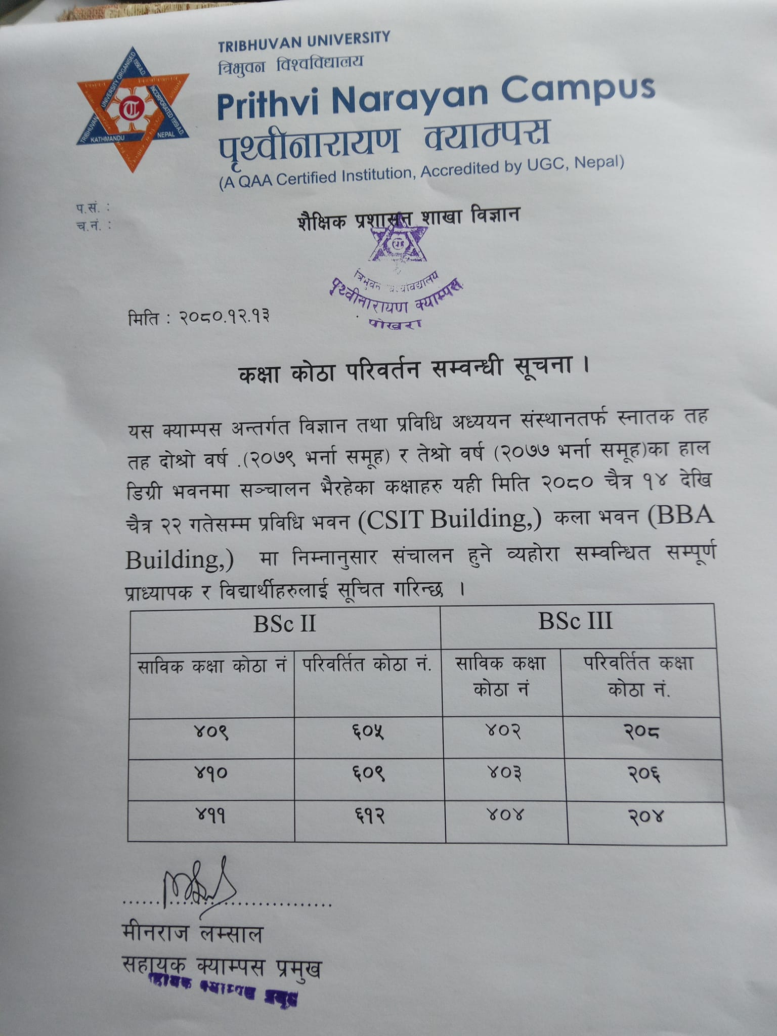B.Sc.II र III yr काे कक्षाकाेठा परिवर्तन गरिएकाे सम्बन्धी सूचना .