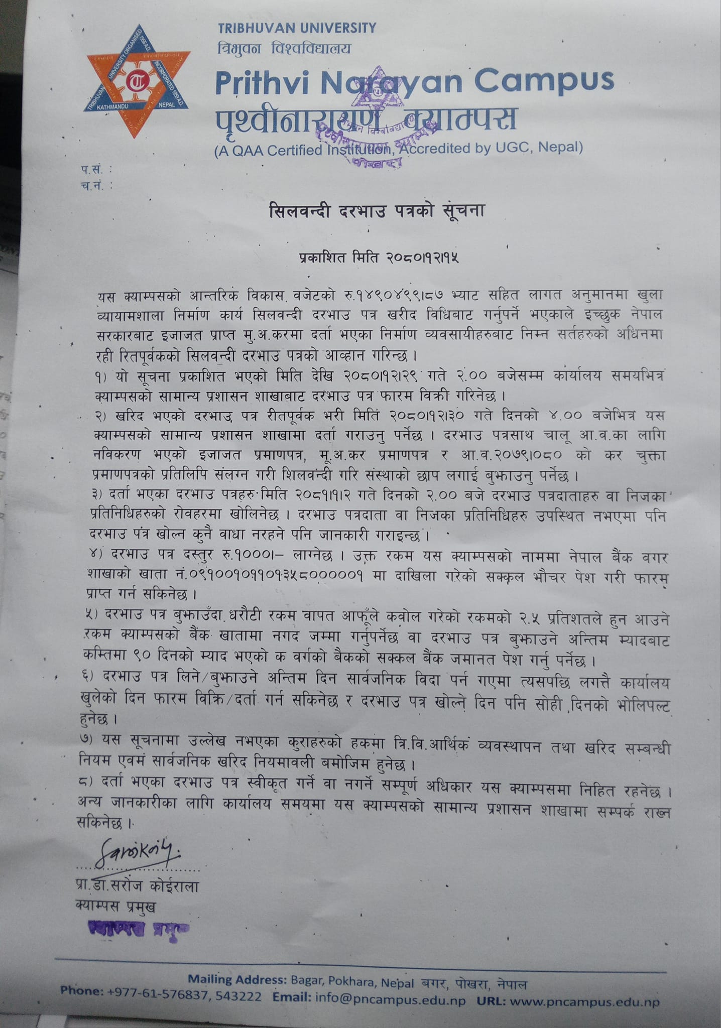 खुल्ला व्यायामशाला निर्माणको लागि सिलवन्दी दरभाउ पत्र आव्हान गरिएको सम्बन्धि सूचना ।