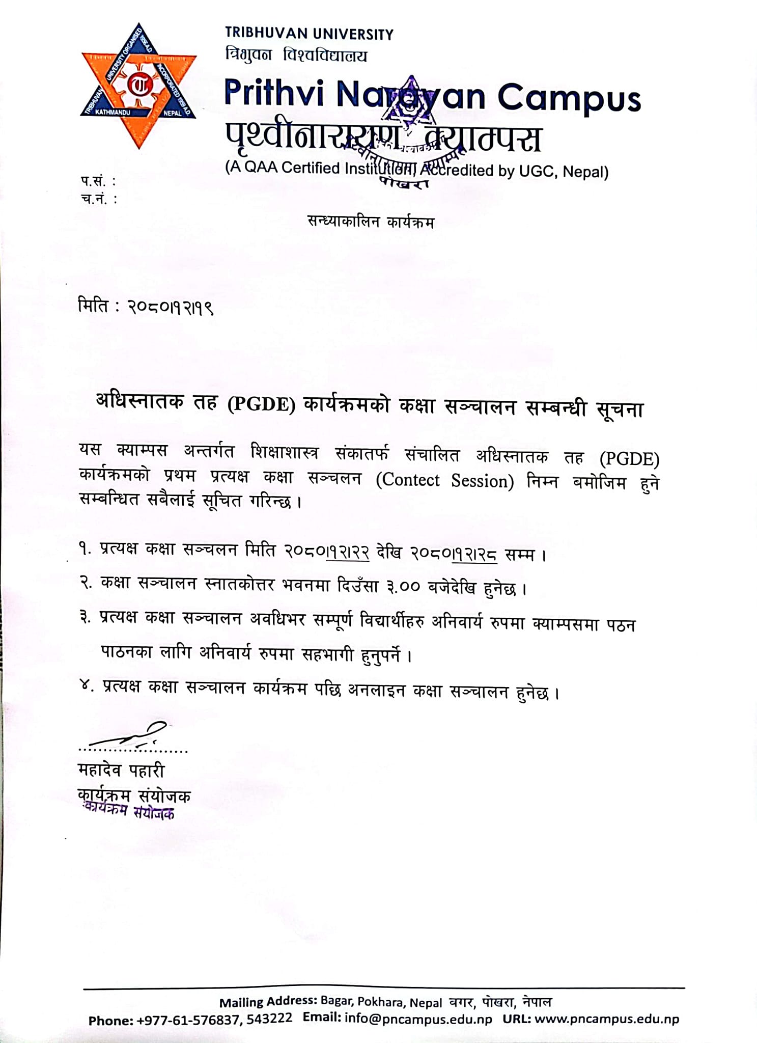 अधिस्नातक तह (PGDE) कार्यक्रमको कक्षा संचालन सम्बन्धी सूचना ।