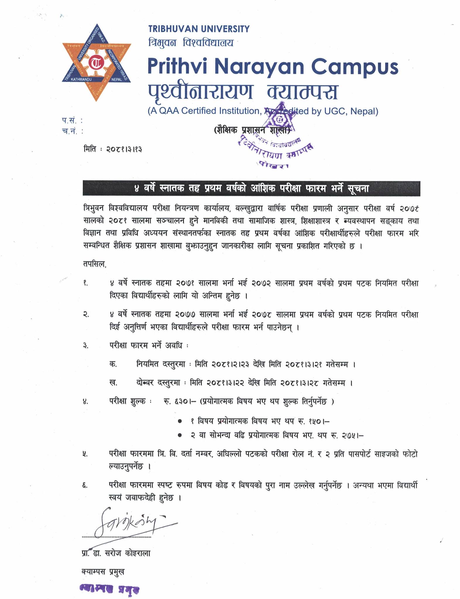 ४ वर्षे स्नातक तह प्रथम वर्षको आशिंक परिक्षा फारम भर्ने सम्बन्धि सूचना ।