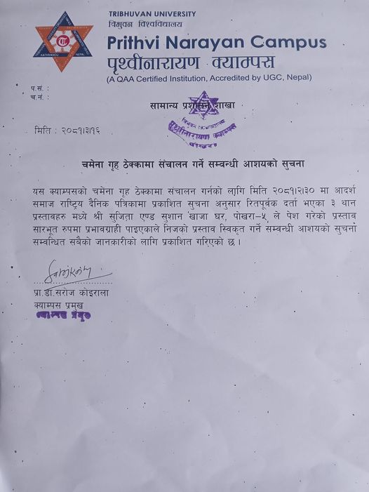 चमेना गृह ठेक्कामा संचालन गर्ने सम्बन्धी आशयकाे सूचना
