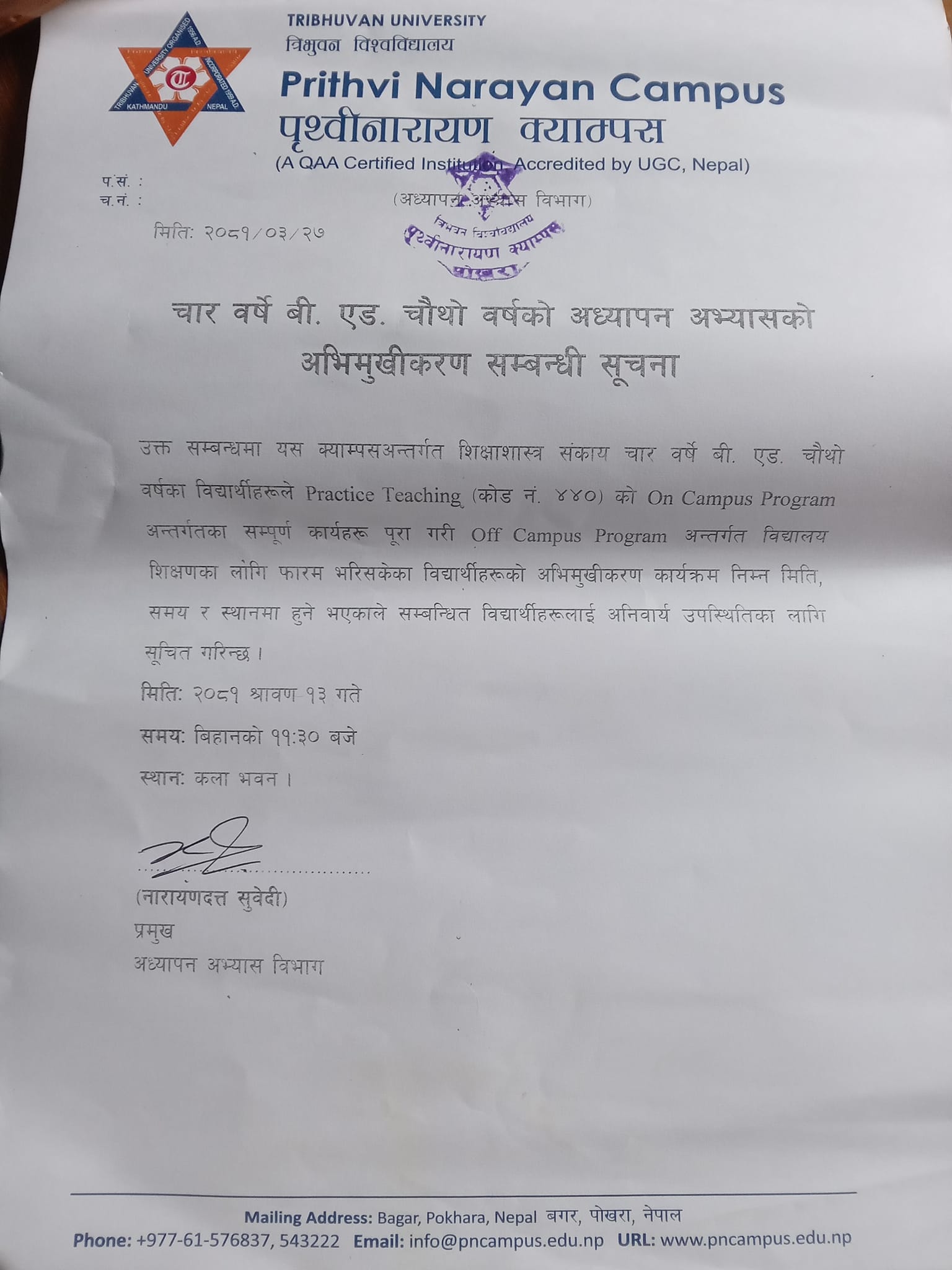 चार वर्षे बी.एड.चाैथाे वर्षको अध्यापन अभ्यासकाे अभिमुखीकरण सम्बन्धी सूचना