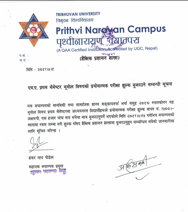 एम. ए. प्रथम सिमेष्टर भुगोल बिषयको प्रयोगात्मक शुल्क तिर्ने सम्बन्धि सुचना