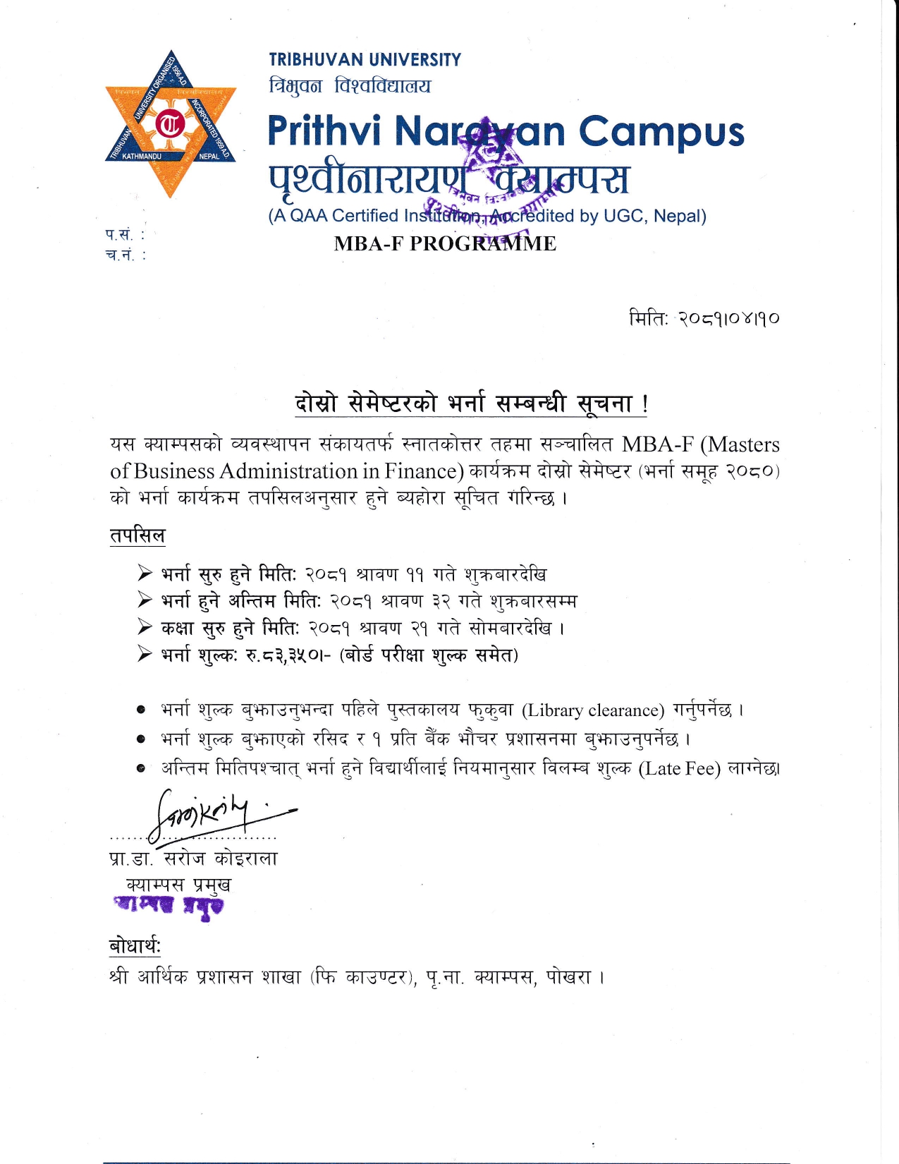 MBA-F दोस्रो सेमेष्टरको भर्ना तथा कक्षा सञ्चालन सम्बन्धी सूचना