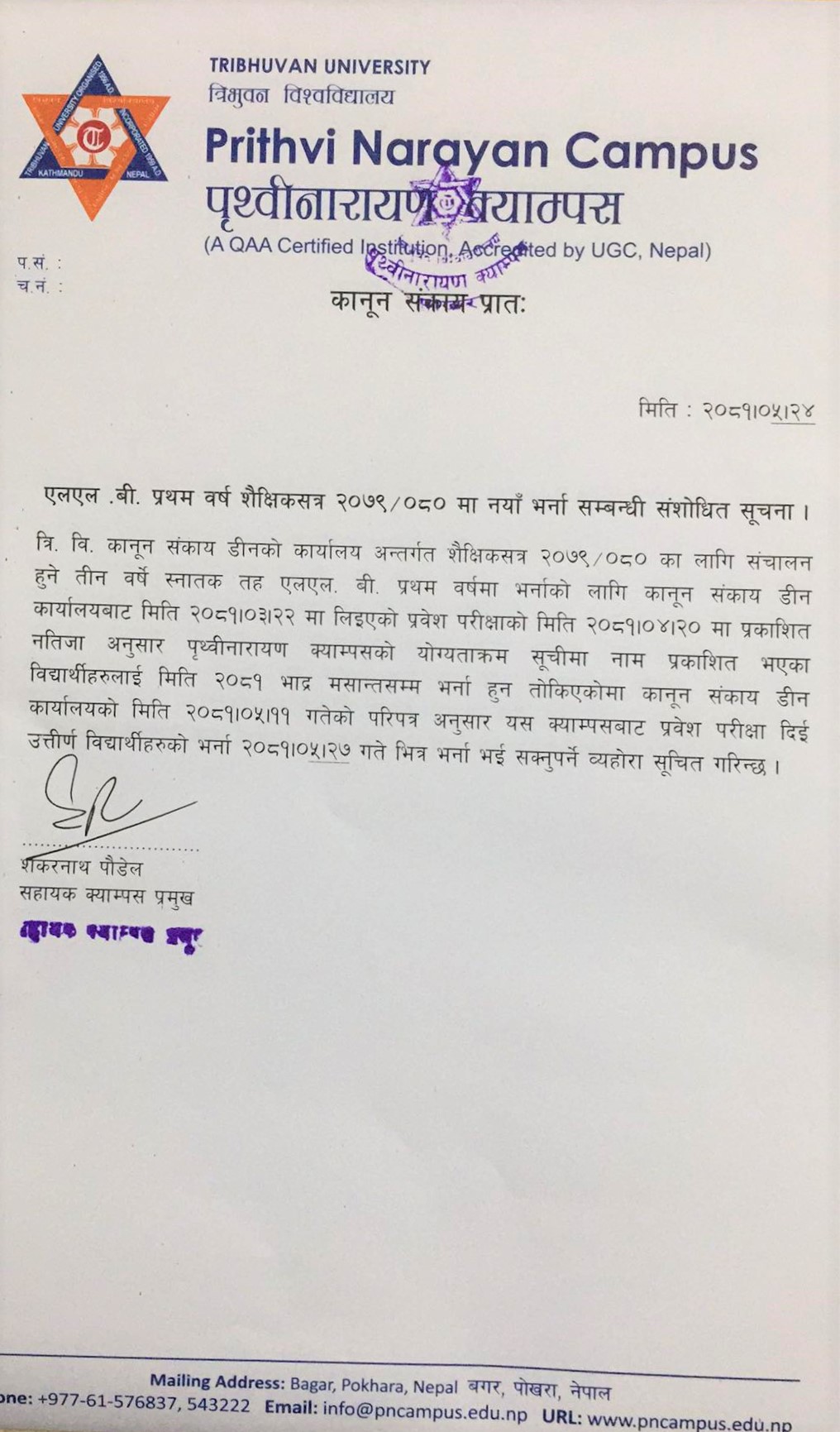 L.L.B. प्रथम वर्ष शैक्षिक सत्र २०७९।८० मा नयाँ भर्ना सम्बन्धी संशोधित सूचना !