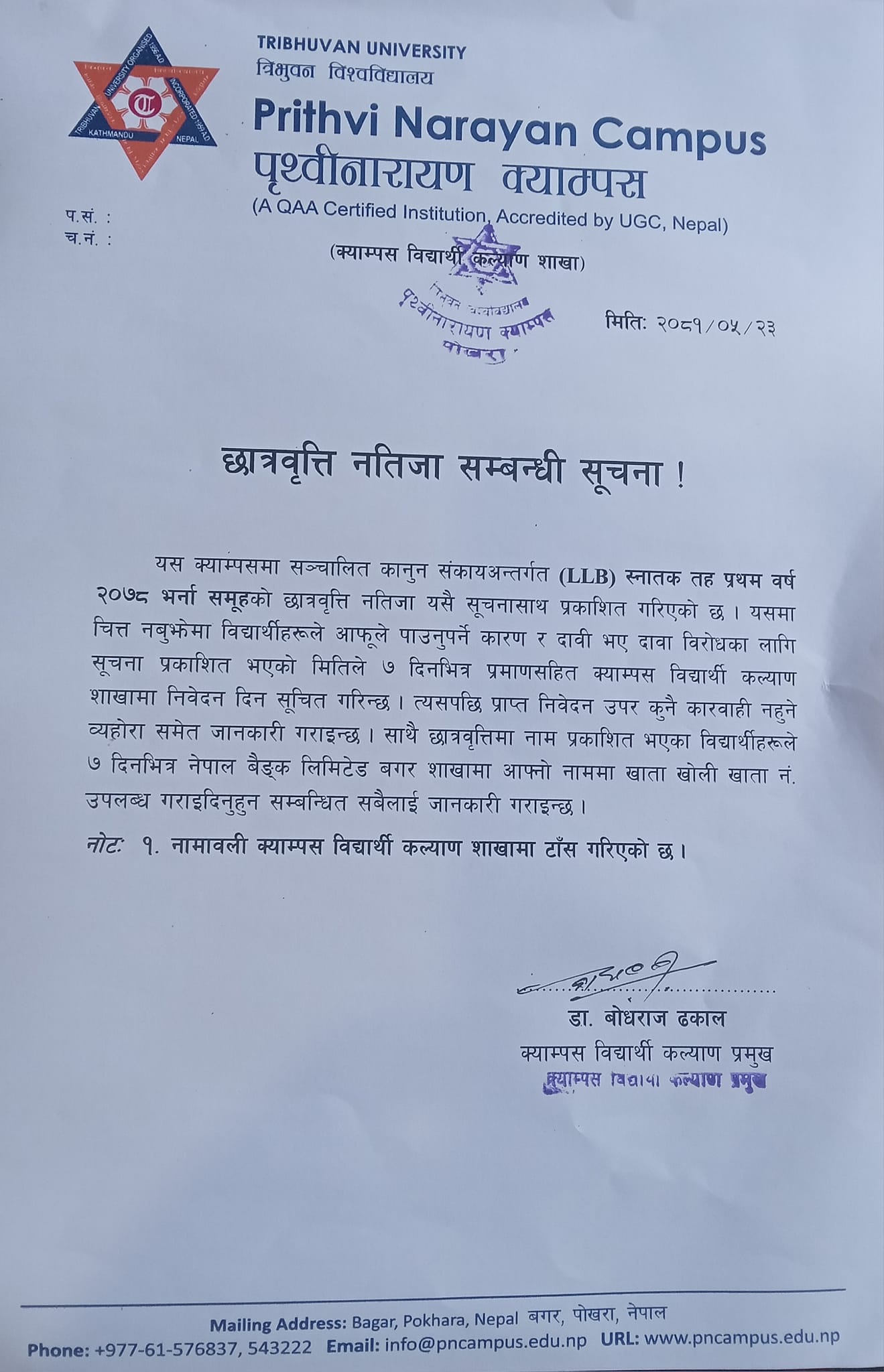छात्रवृत्ति नतिजा सम्बन्धी सूचना प्रकाशित गरिएकाे छ ।