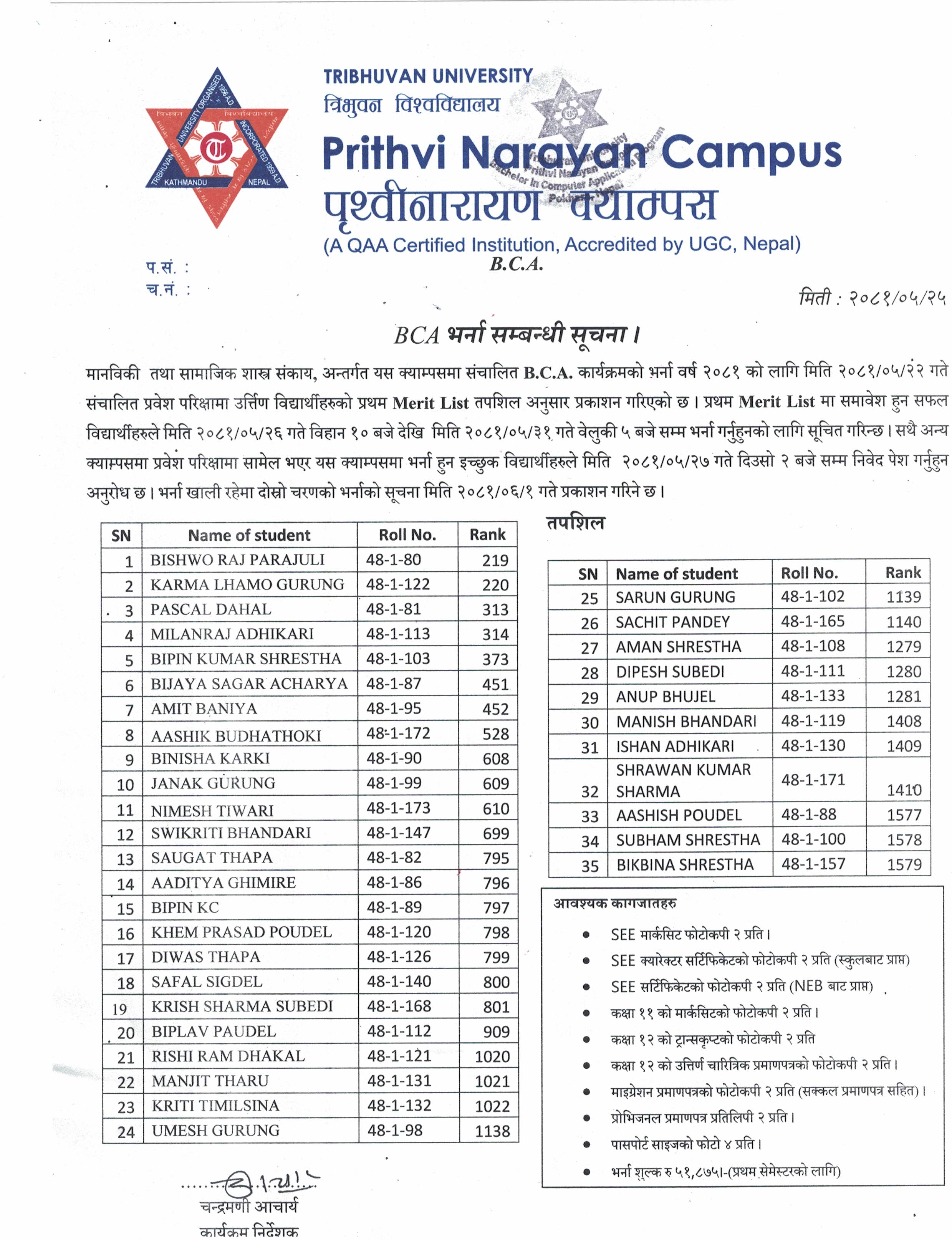 B.C.A. प्रवेश परिक्षाको नतिजा प्रकाशन तथा भर्ना सम्बन्धि प्रथम सूचि प्रकाशन गरिएको सम्बन्धि सूचना । प्रथम सुचिमा समावेश हुन सफल विद्यार्थीहरुले मिति २०८१/०५/३१ साँझ ५ बजे सम्म भर्ना गर्नुहुन सूचित गरिन्छ ।