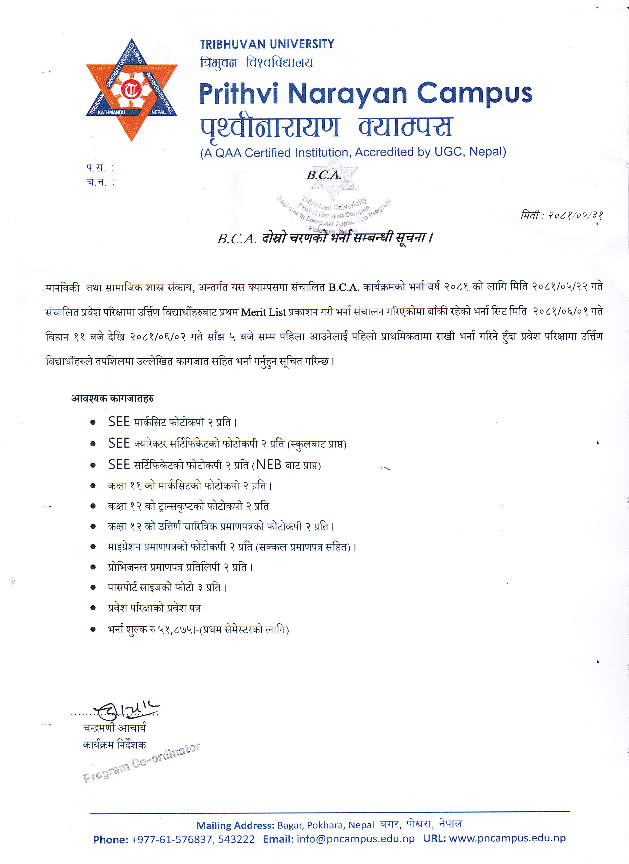 B.C.A. दोस्रो चरणको भर्ना सम्बन्धी सूचना ।