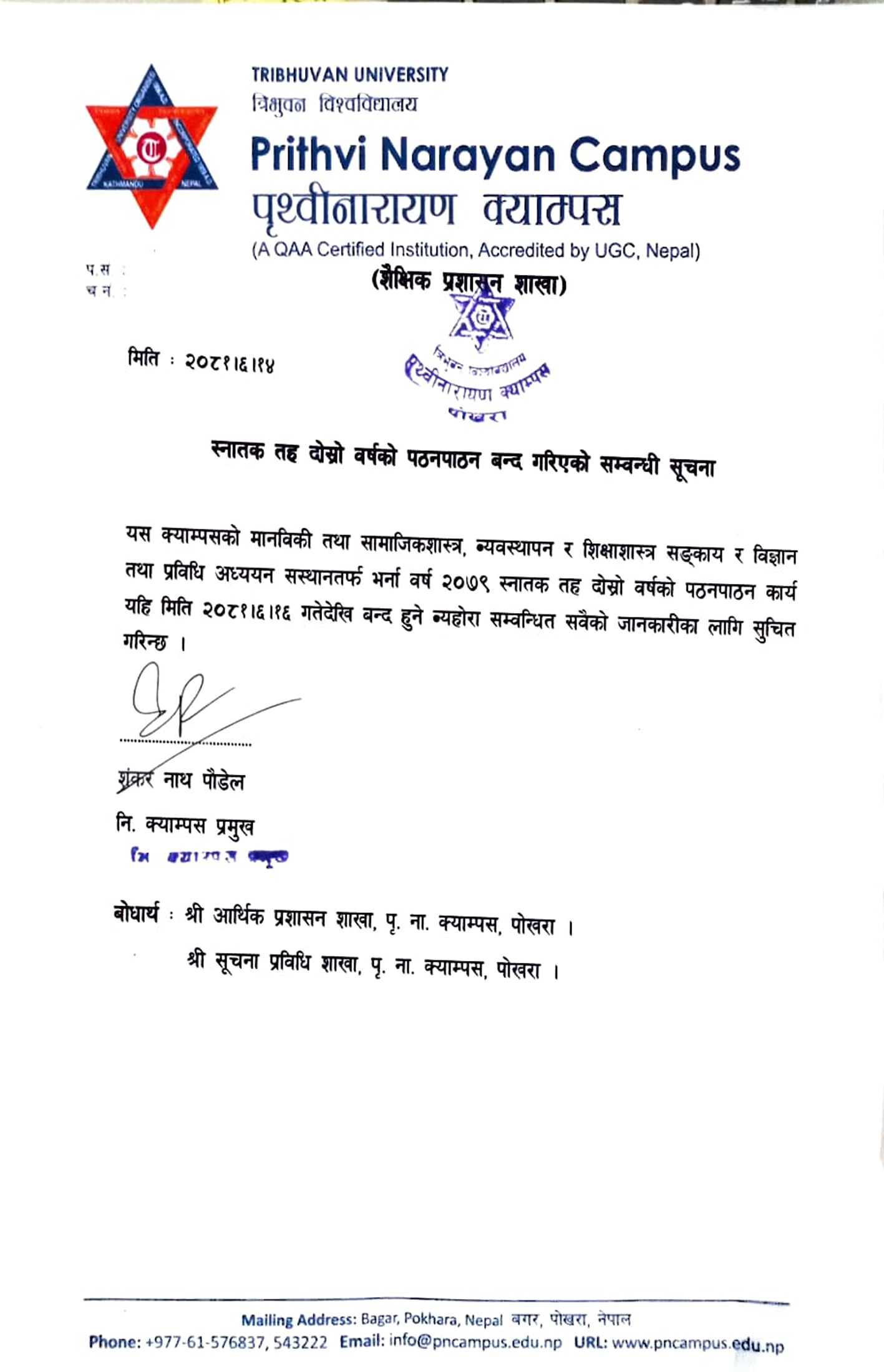 स्नातक तह दोस्रो बर्ष पठनपाठन बन्द गरिएको सम्वन्धि सूचना