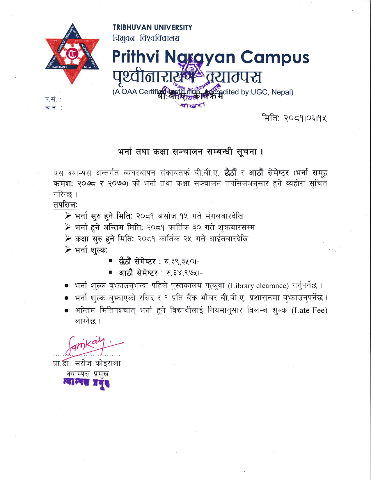 बी.बी.ए. छैठौँ र आठौँ सेमेष्टरको भर्ना तथा कक्षा सञ्चालन सम्बन्धी सूचना ।