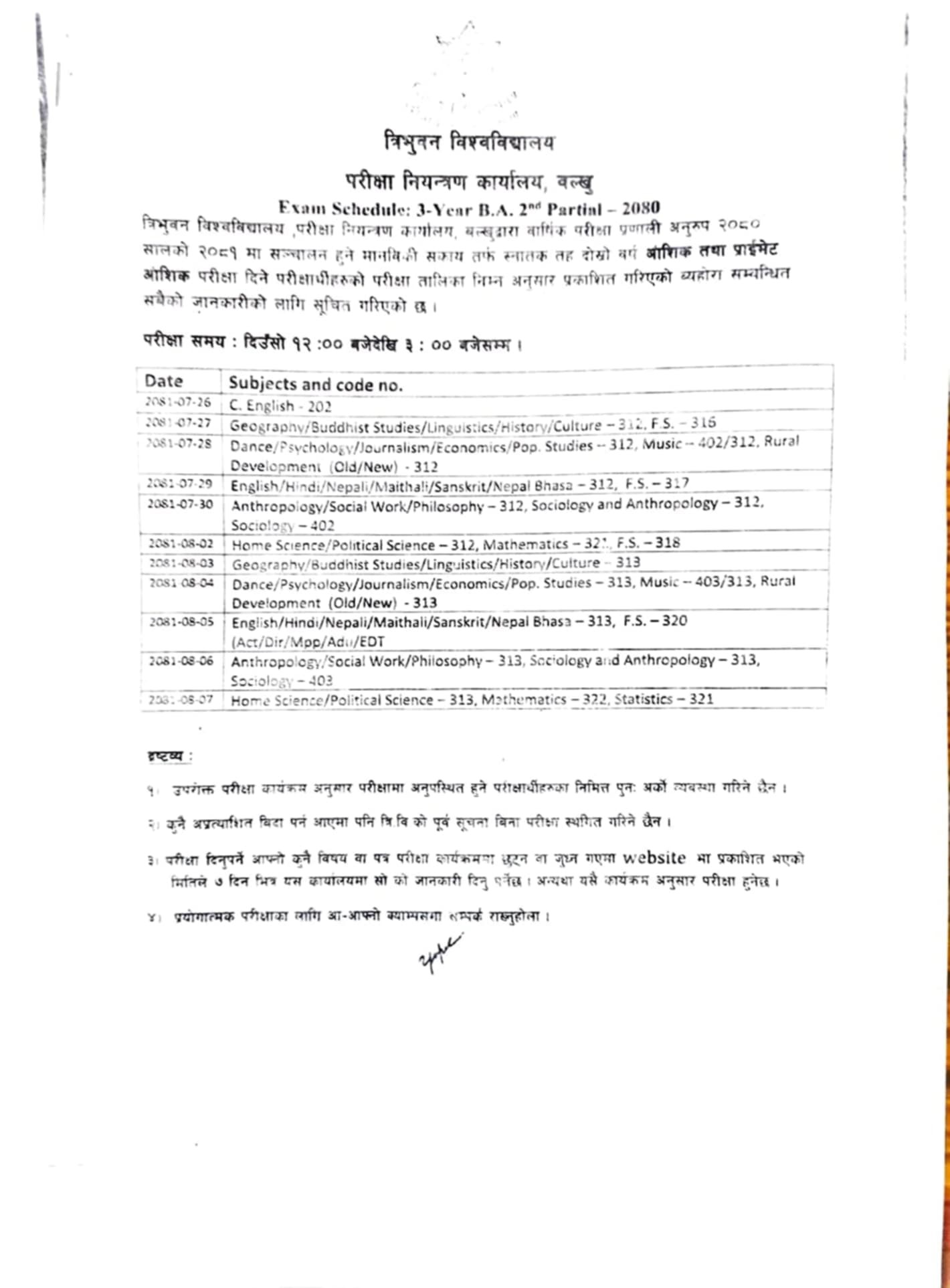 मानविकि संकाय दोस्रो बर्षको आंशिक तथा प्राईभेट परिक्षा तालिका सम्बन्धि सूचना