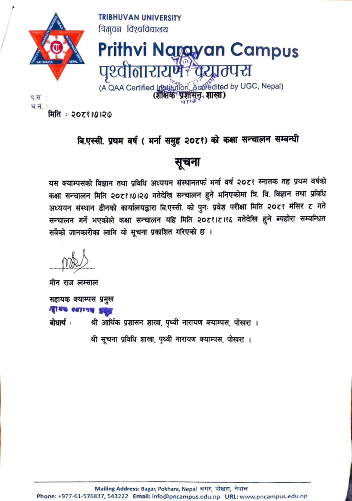 Bsc प्रथम बर्षको भर्ना तथा कक्षा संचालन संबन्धी सूचना