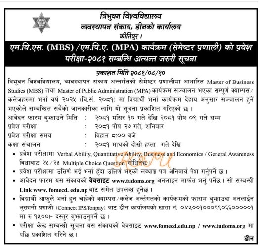 MBS/MPA मा भर्नाको लागि प्रवेश परीक्षा फारम
