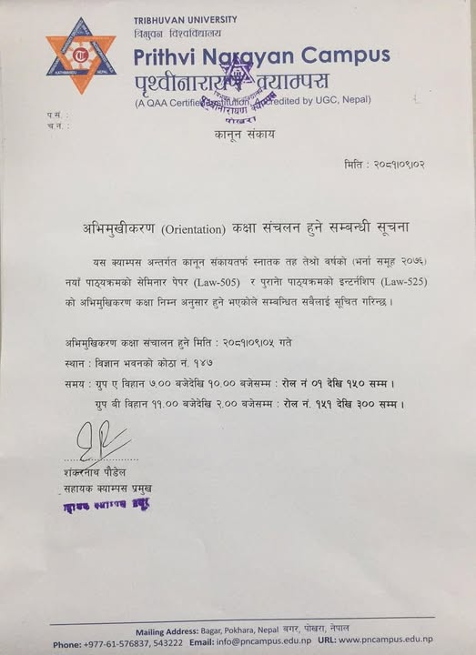 एल.एल.बी. तेस्रो वर्षको अभिमूखिकरण सम्बन्धी सूचना ।