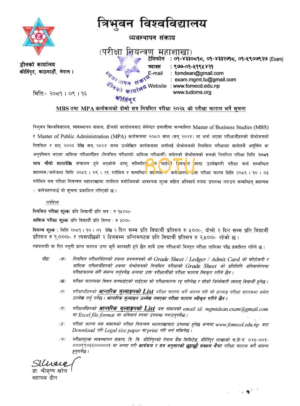 MBS तथा MPA कार्यक्रमको दोश्रो सत्र नियमित परीक्षा २०२५ को परीक्षा फारम भर्ने सूचना।