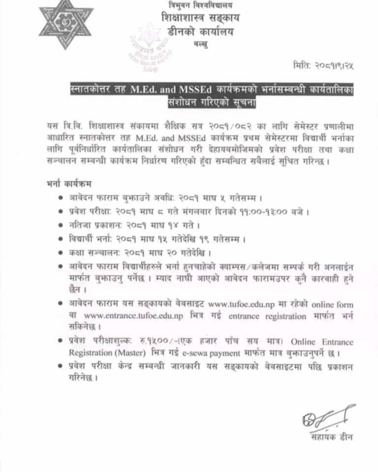 स्नातकोत्तर तह (M.Ed.) कार्यक्रमको भर्ना सम्बन्धी कार्यतालिका संशोधन गरिएको सूचना ।