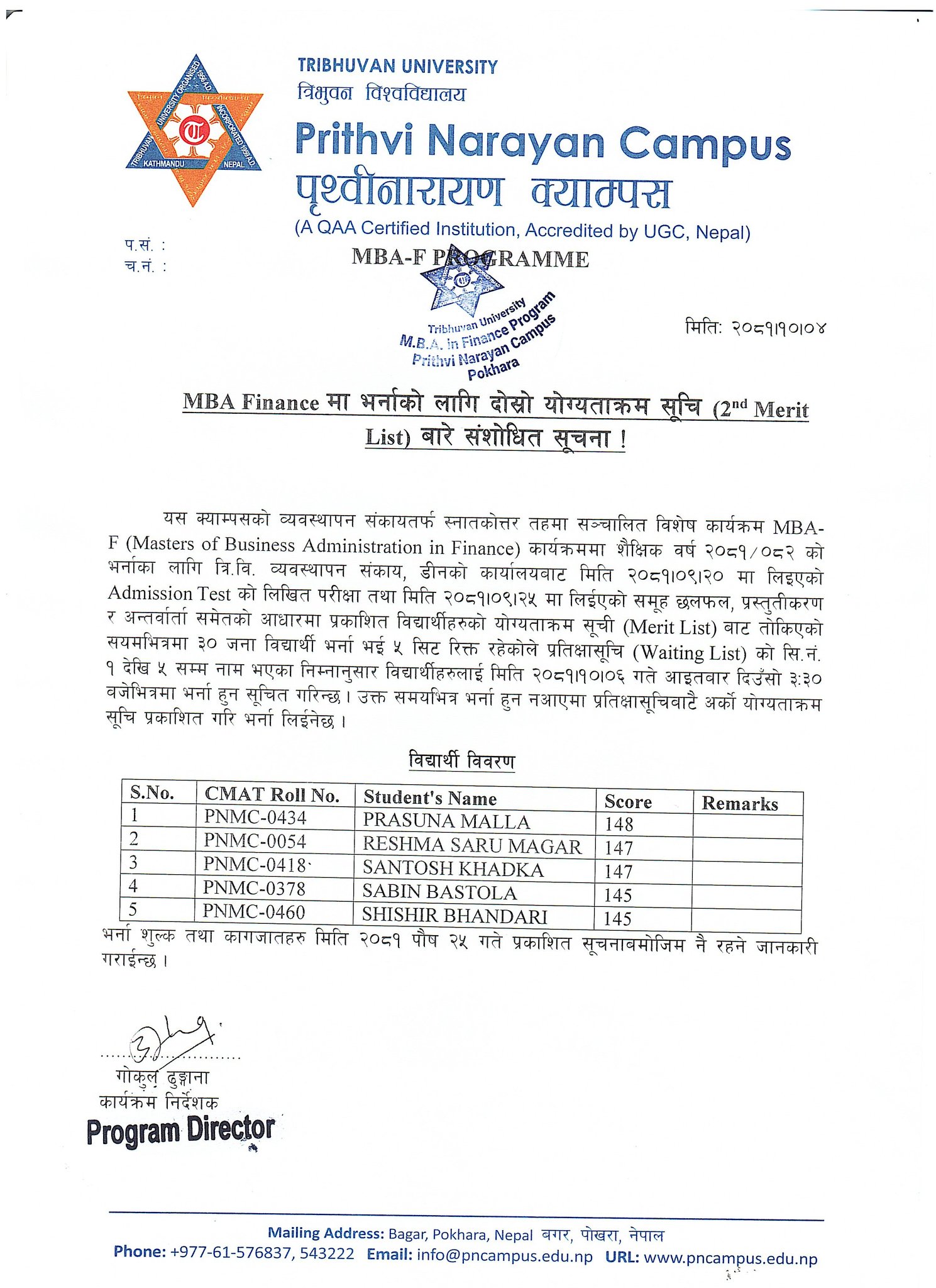 MBA Finance मा भर्नाको लागि दोस्रो मेरिट लिस्ट बारे संशोधित सूचना।