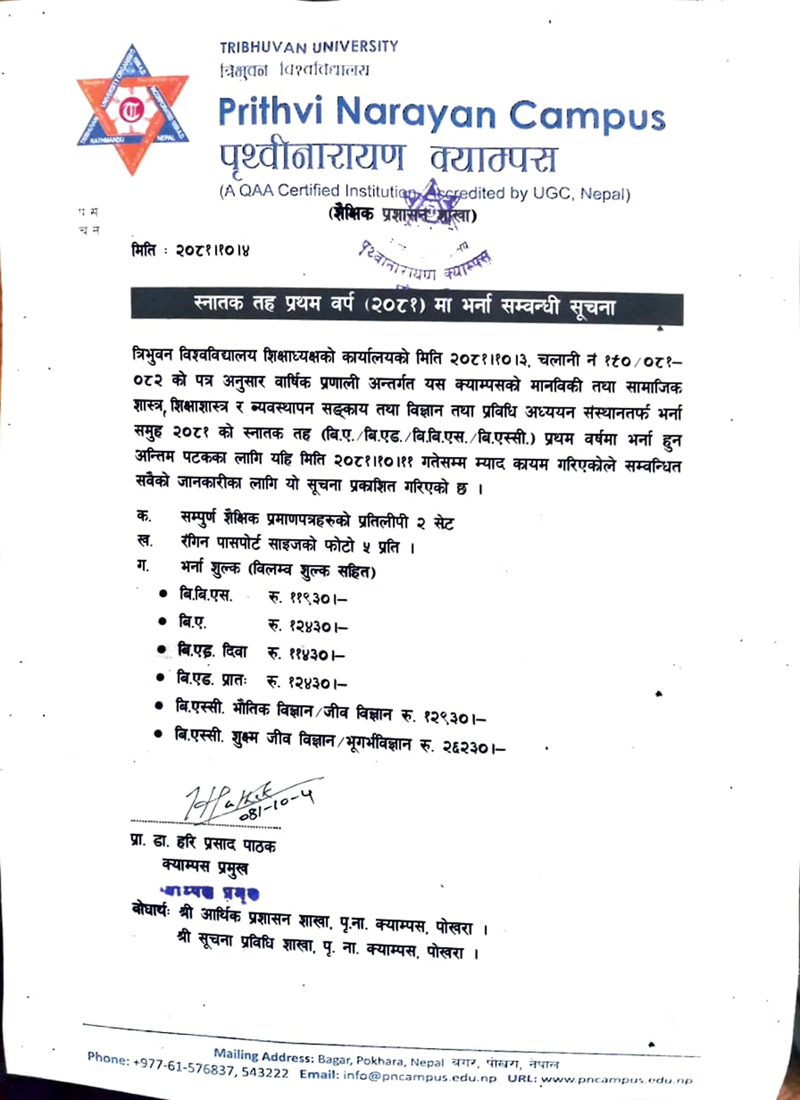 स्नातक तह प्रथम बर्ष २०८१ मा भर्ना सम्बन्धी सुचना