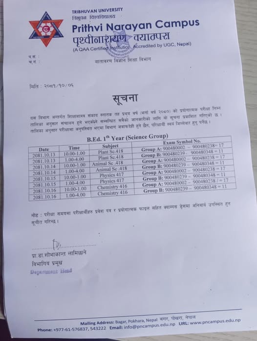 Practical exam schedule of B.Ed. (Science) First year 2080 batch