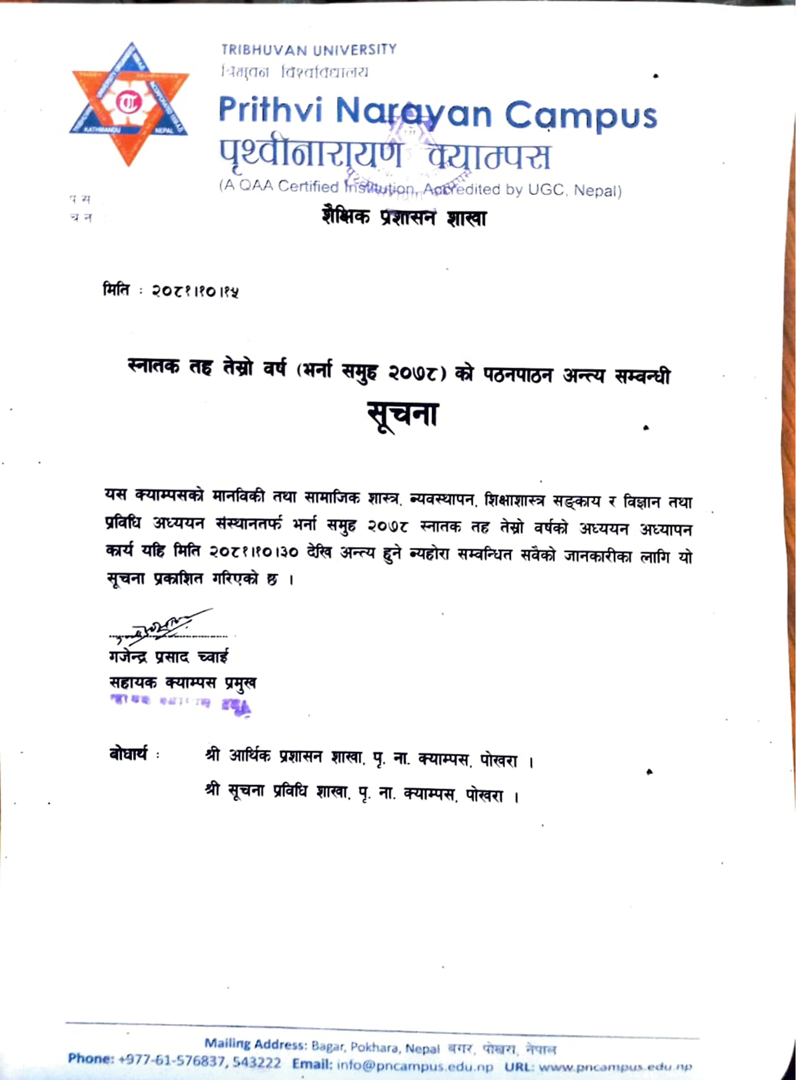 स्नातक तह तेस्रो बर्ष भर्ना समुह 2078 को पठनपाठन सम्बन्धी सूचना