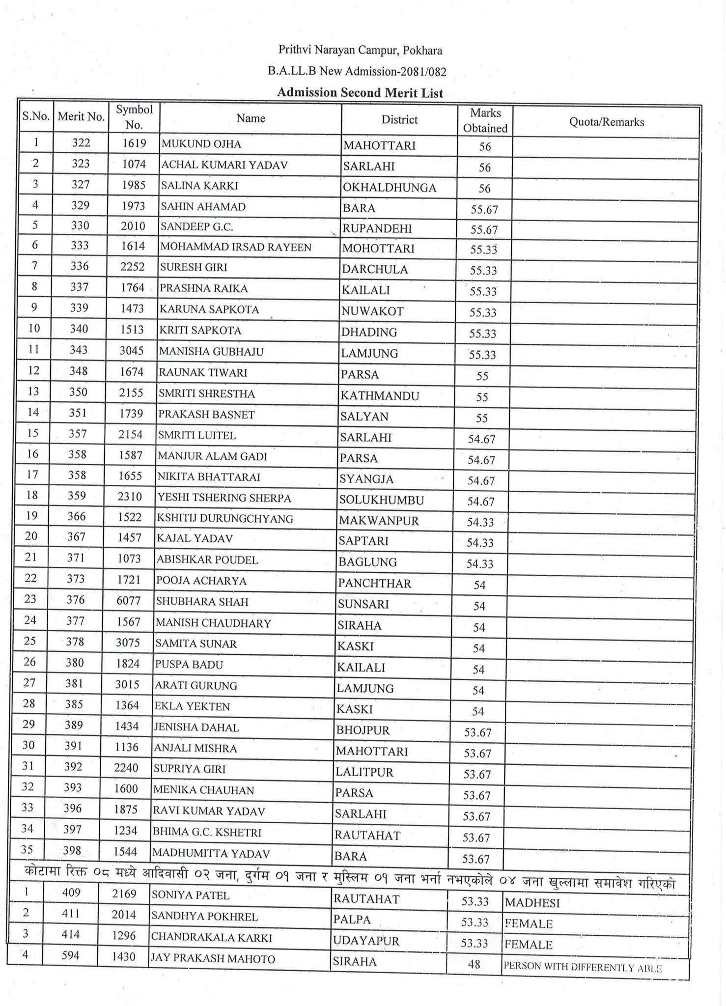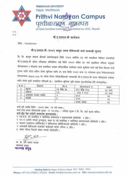 बी.ए.एलएल.वी (२०८१ समूह) प्रथम सेमेष्टरको भर्नाको दोस्रो सूची प्रकाशन गरीएको सम्बन्धी सूचना ।