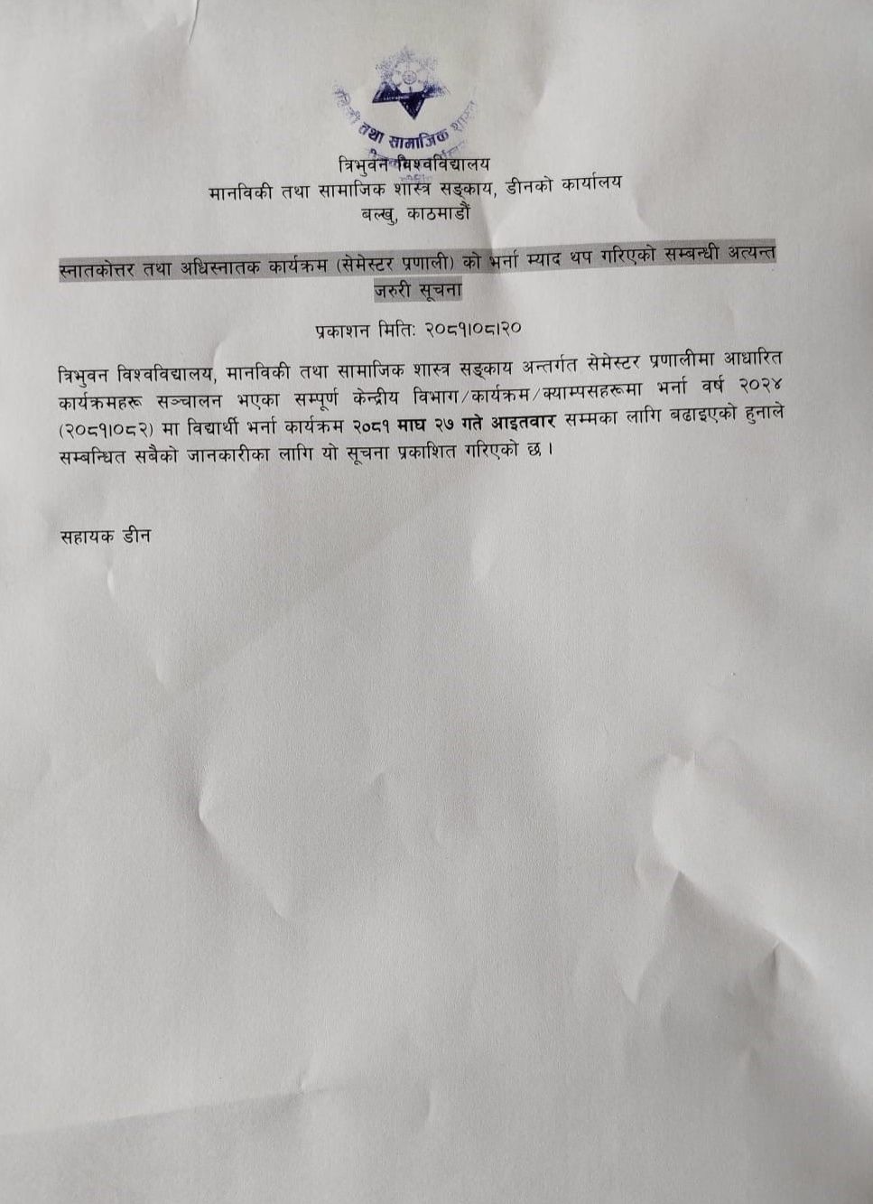 M.A. प्रथम सेमेस्टरको भर्ना म्याद थप गरिएको सम्बन्धी जरूरी सूचना।