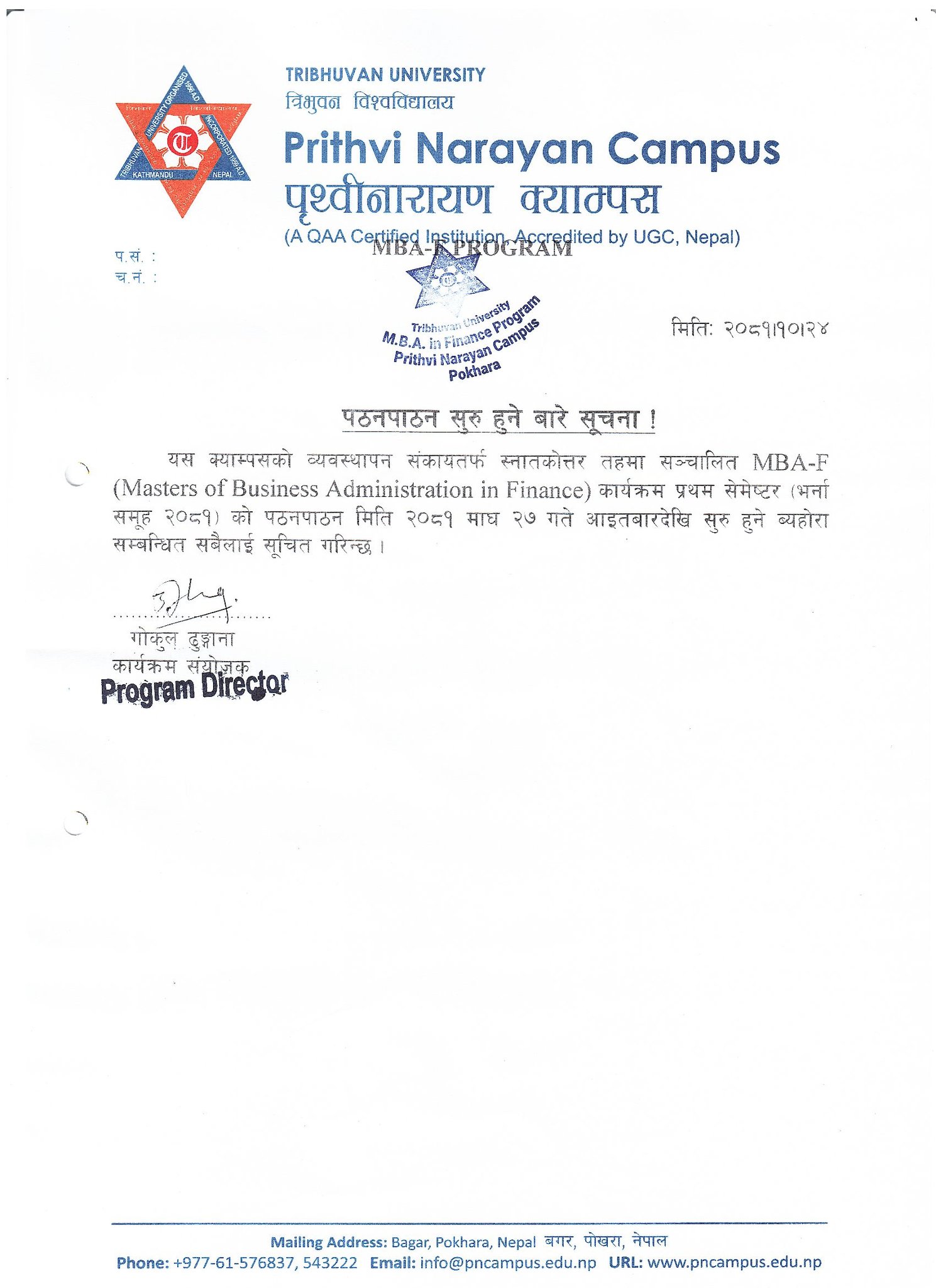 MBA Finance प्रथम सेमेस्टरको पठनपाठन सञ्चालन सम्बन्धी सूचना।