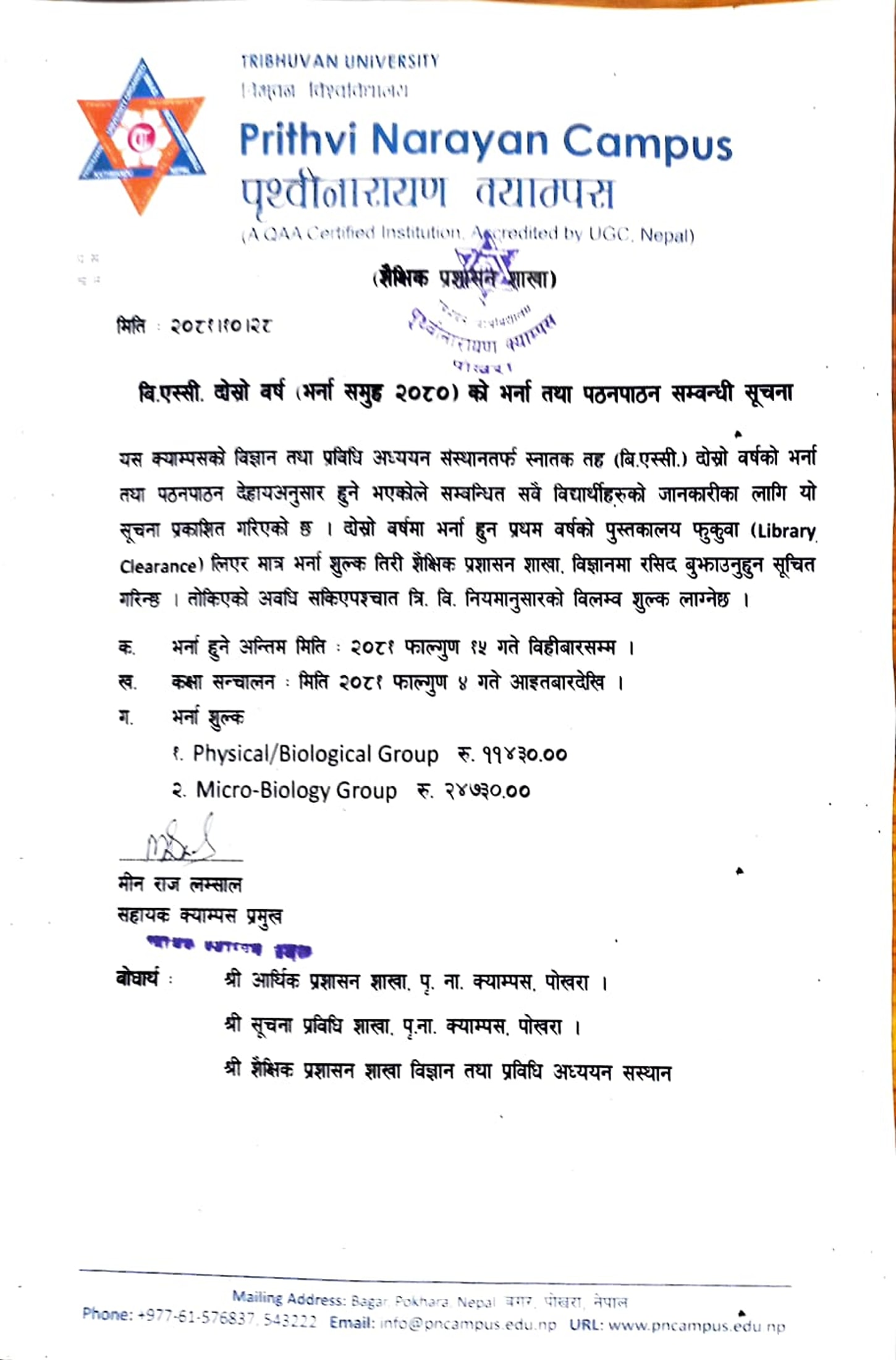 बि.एस्सी दोस्रो बर्ष को भर्ना तथा पठनपाठन सम्बन्धी सुचना।