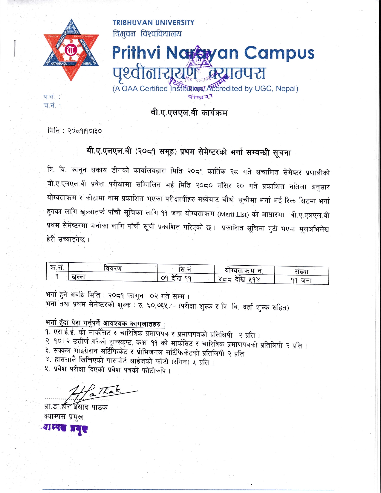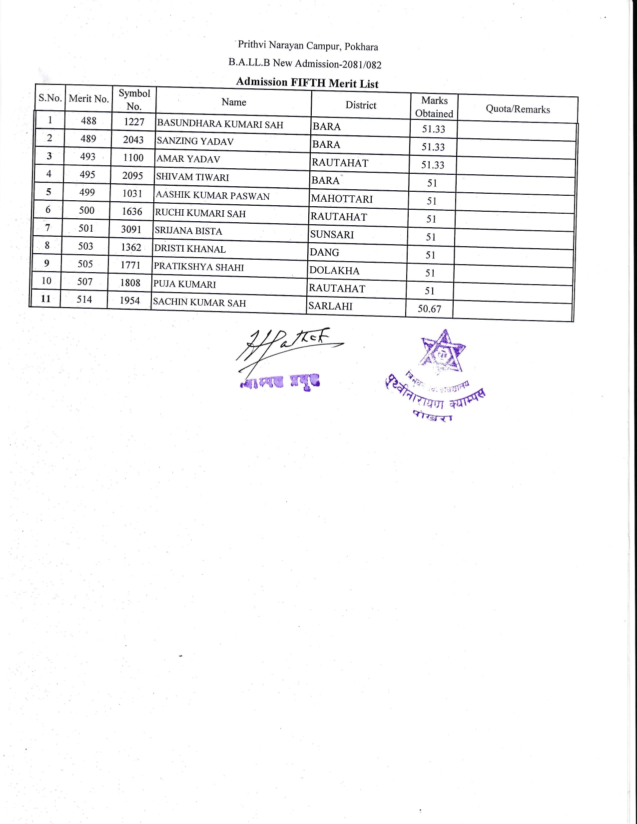 बी.ए.एलएल.वी (२०८१ समूह) प्रथम सेमेष्टरको भर्नाको पांचौ सूची प्रकाशन गरिएको सम्बन्धी सूचना ।