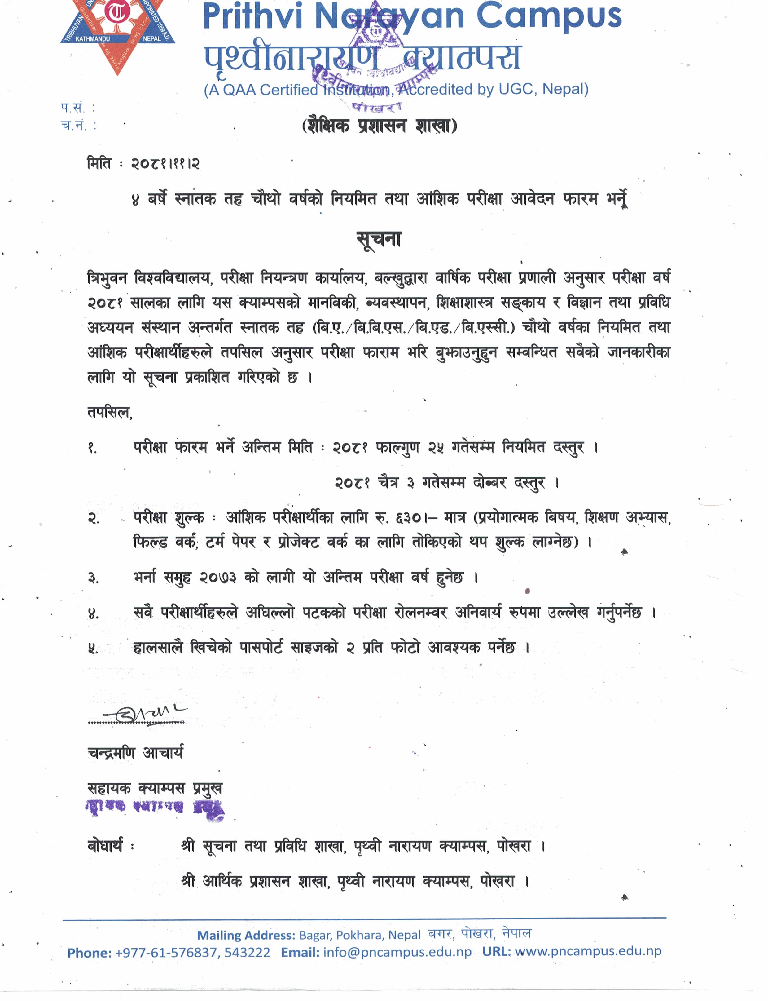 ४ बर्षे स्नातक तह चौंथो वर्षको नियमित तथा आंशिक परीक्षा आवेदन फारम भर्ने सूचना