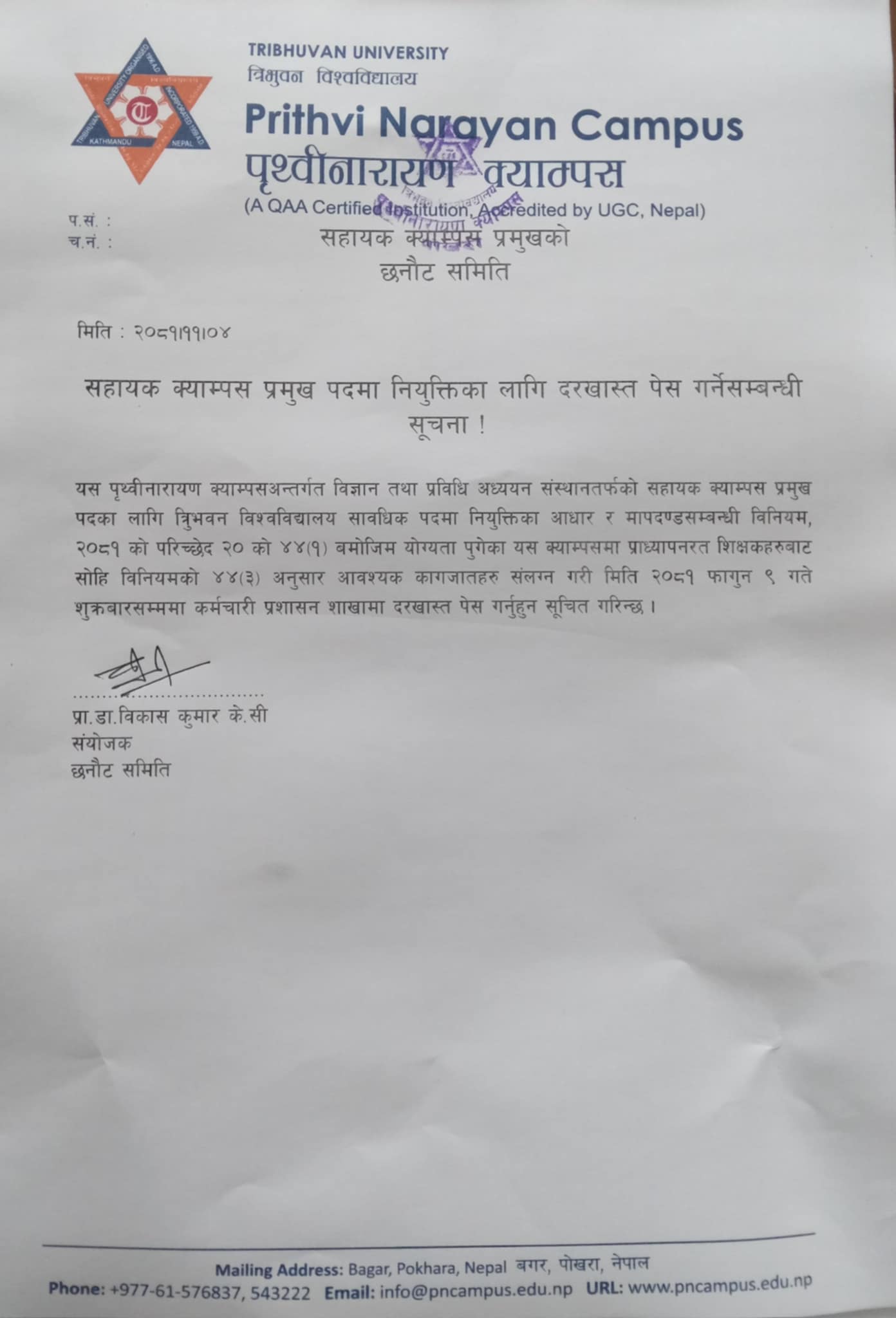 सहायक क्याम्पस प्रमुख पदमा नियुक्तिका लागि दरखास्त पेस गर्नेसम्बन्धी सूचना !