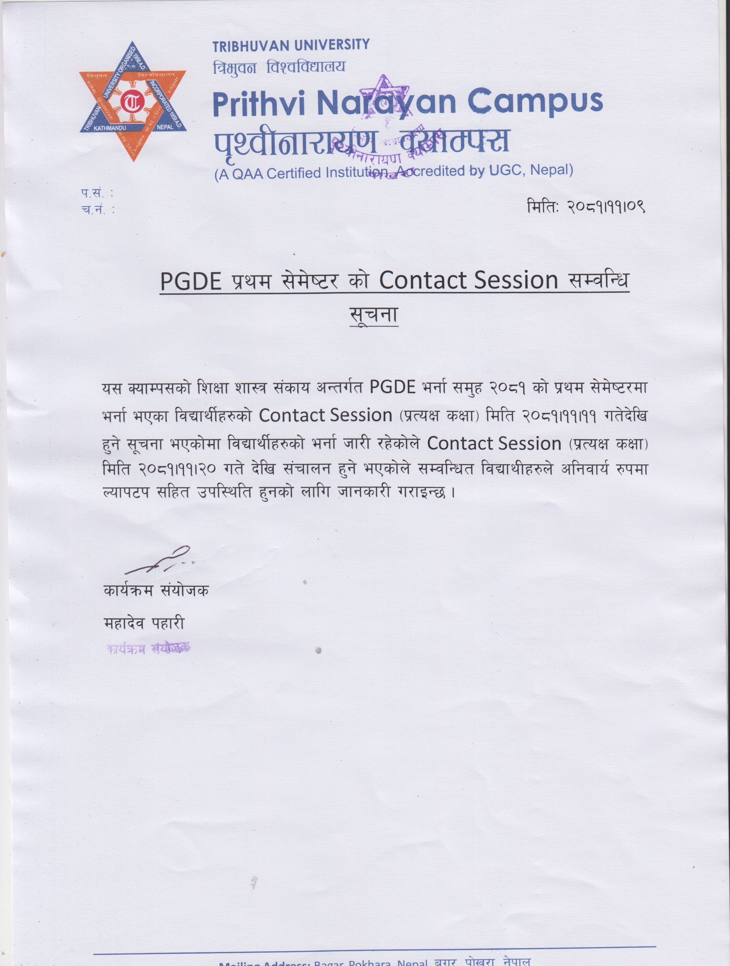 PGDE प्रथम सेमेष्टरको Contact Session सम्बन्धि सूचना