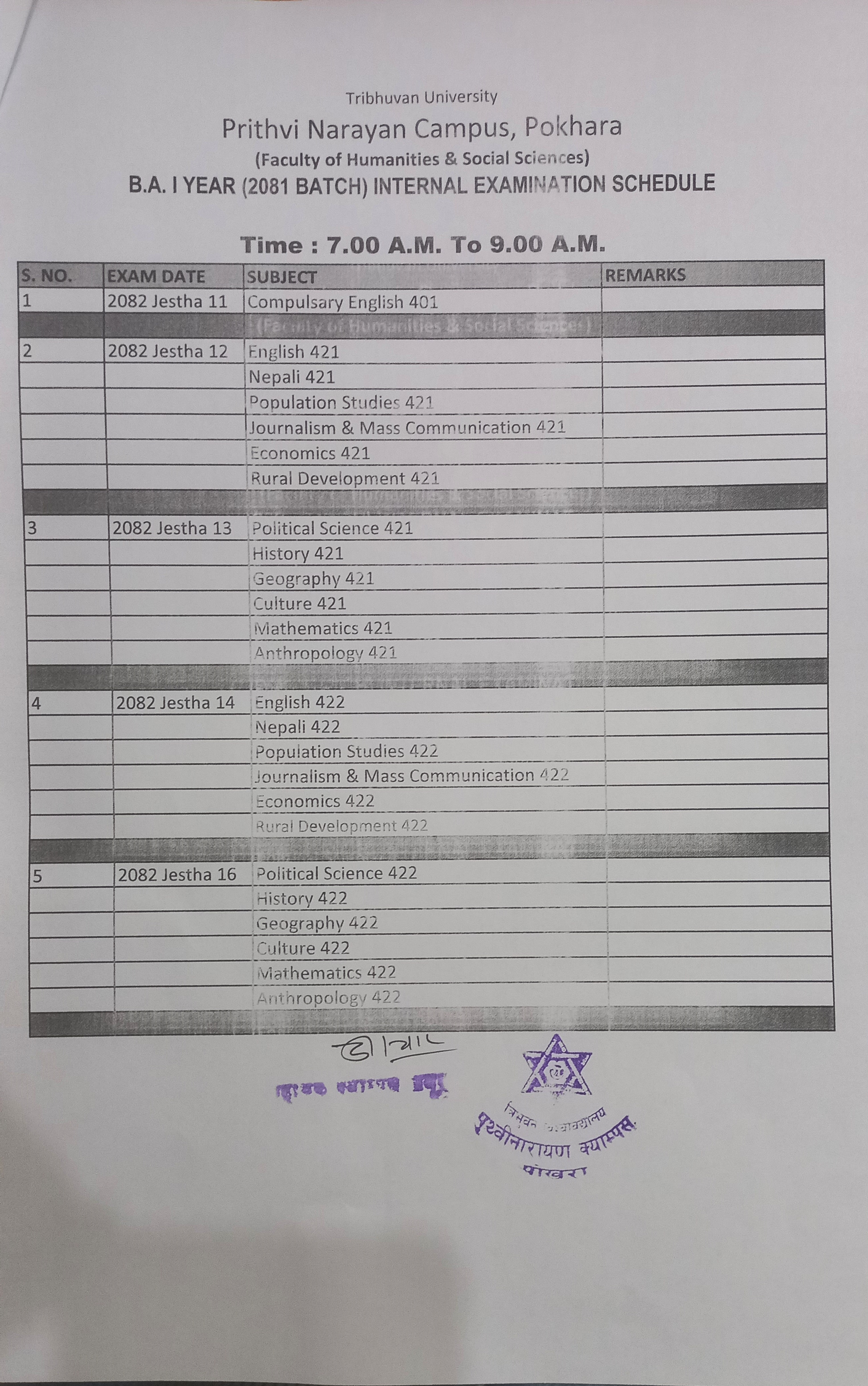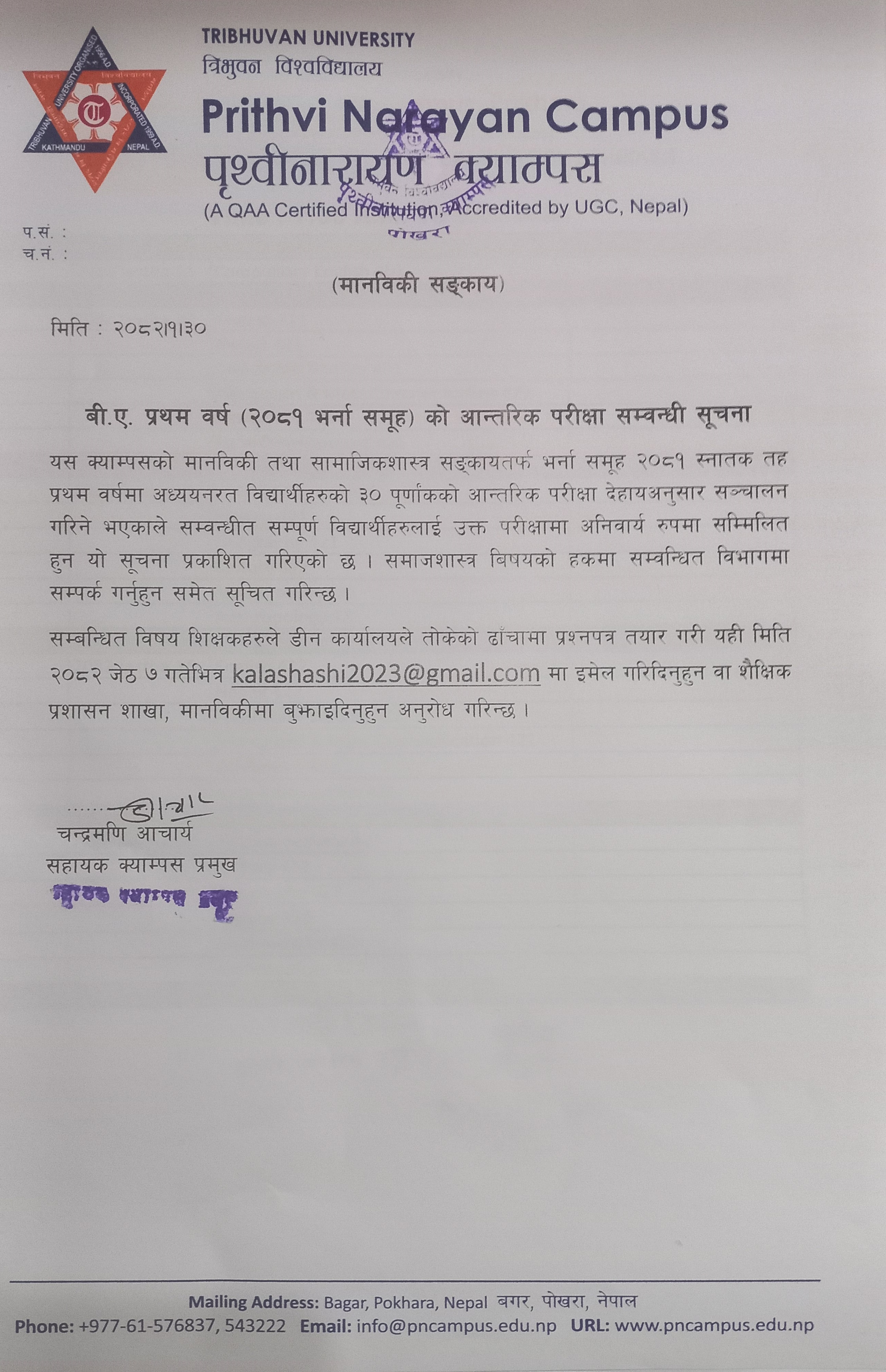BA प्रथम वर्ष २०८१ भर्ना समूह को आन्तरिक परिक्षा सम्बन्धी सूचना