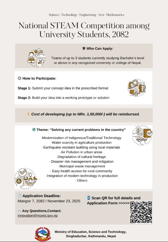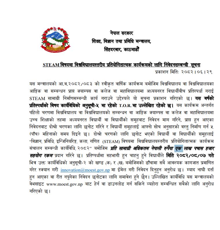 विश्वविद्यालयका विद्यार्थीहरु बिच STEAM Materials निर्माण प्रतिस्पर्धाको लागि निवेदन सम्बन्धि सूचना