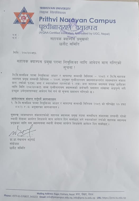 सहायक क्याम्पस प्रमुख पदमा नियुक्तिका लागि आवेदन माग गरिएको सूचना