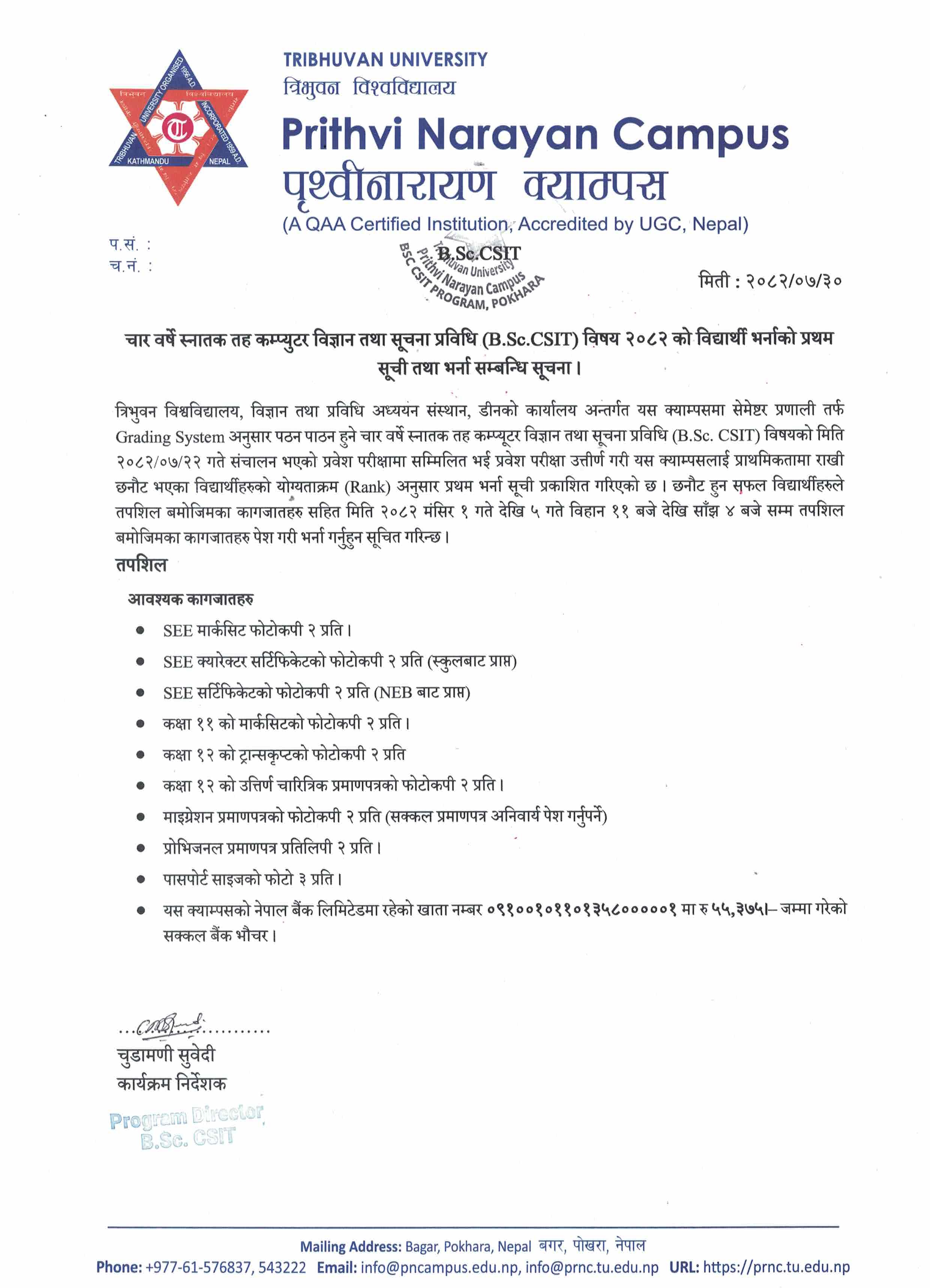 चार वर्षे स्नातक तह कम्प्युटर विज्ञान तथा सूचना प्रविधि (B.Sc. CSIT) विषय २०८२ को विद्यार्थी भर्ना प्रथम सूची ।