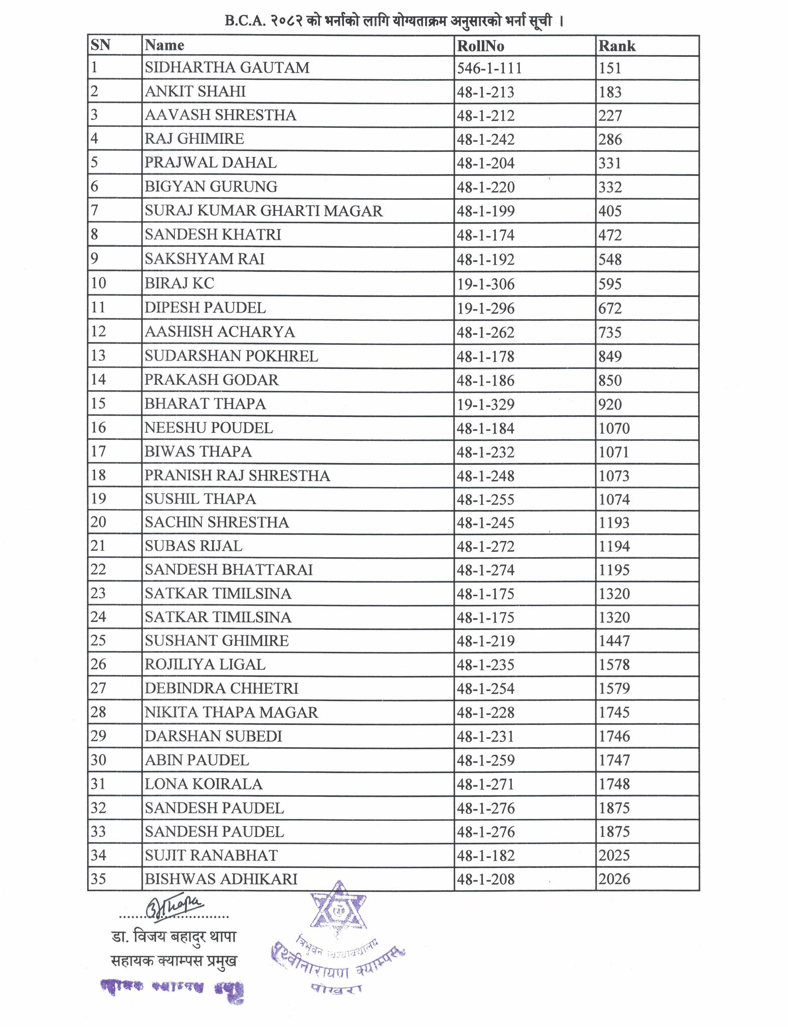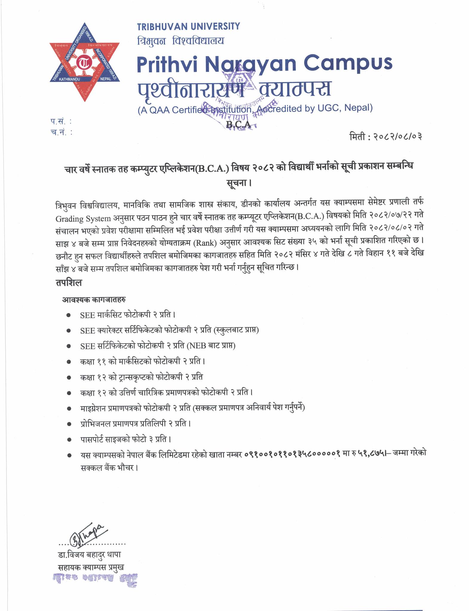 चार वर्षे स्नातक तह कम्प्युटर एप्लिकेशन (B.C.A.) विषय २०८२ को विद्यार्थी भर्नाको सूची प्रकाशन सम्बन्धि सूचना ।
