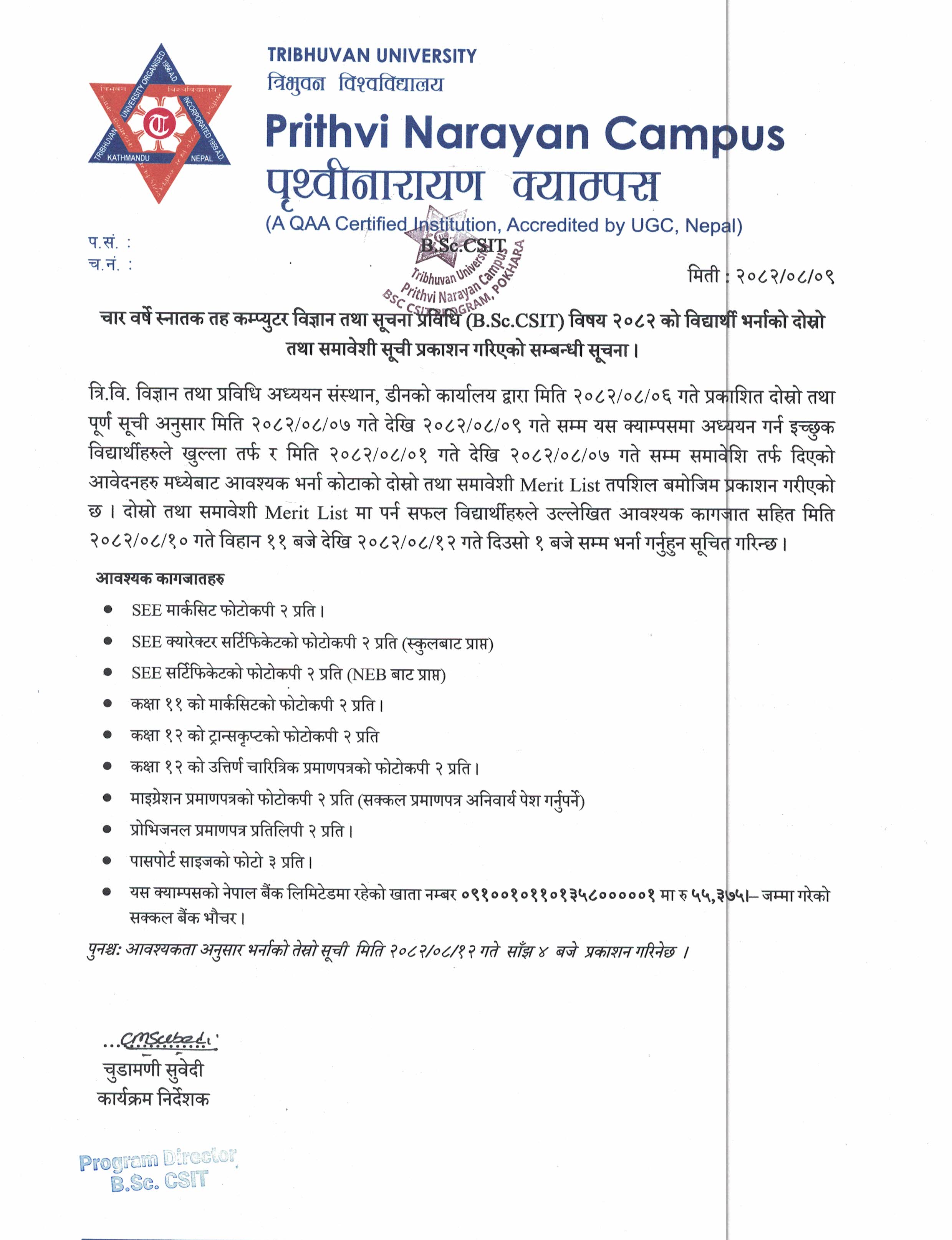 चार वर्षे स्नातक तह कम्प्युटर विज्ञान तथा सूचना ये (B.Sc. CSIT) विषय २०८२ को विद्यार्थी भर्नाको दोस्रो तथा समावेशी सूची प्रकाशन गरिएको सम्बन्धी सूचना ।
