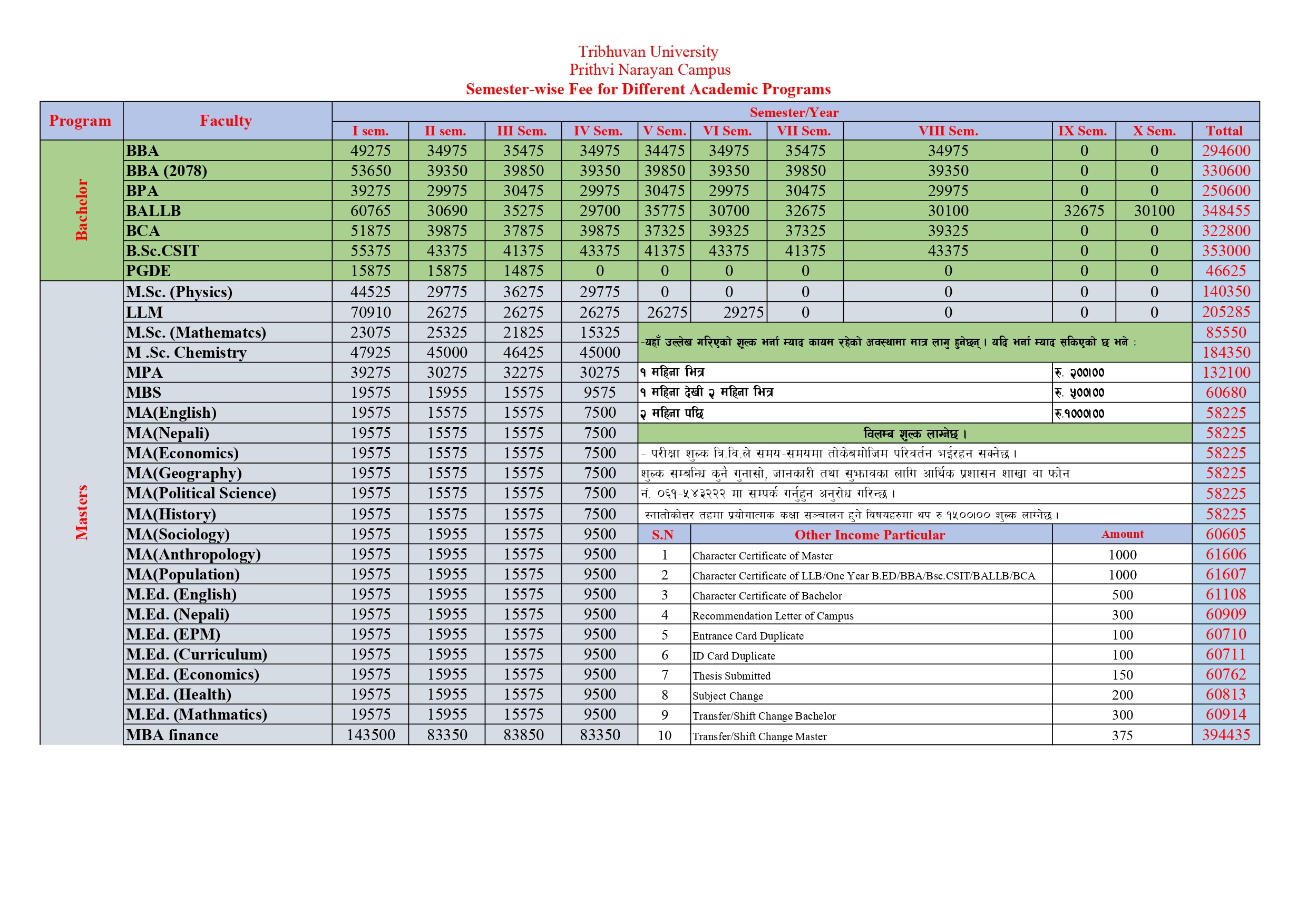 स्नातक र स्नातोकोत्तर तहका सेमेष्टर प्रणालीका विद्यार्थीका लागि लागु शुल्क विवरण